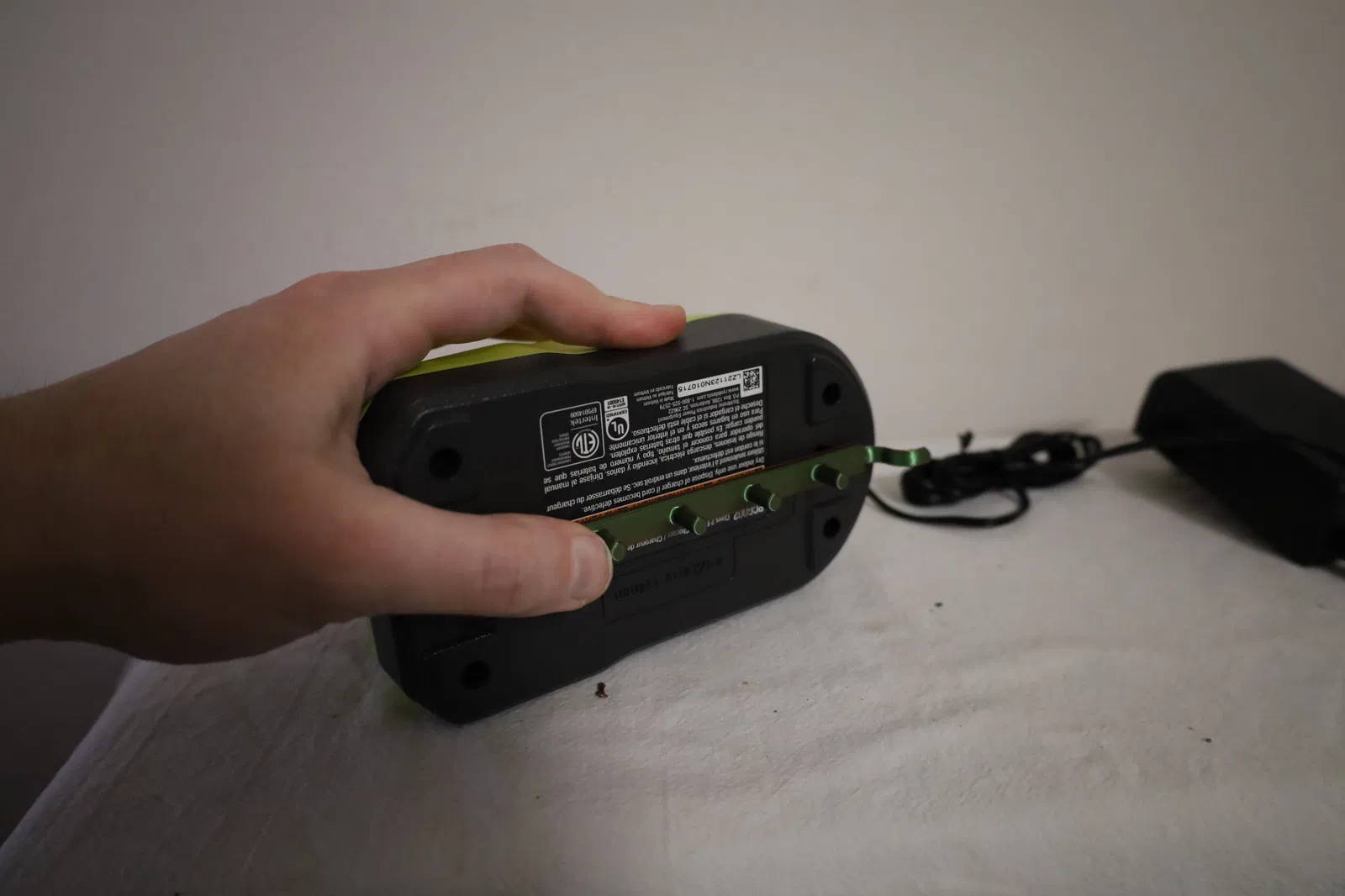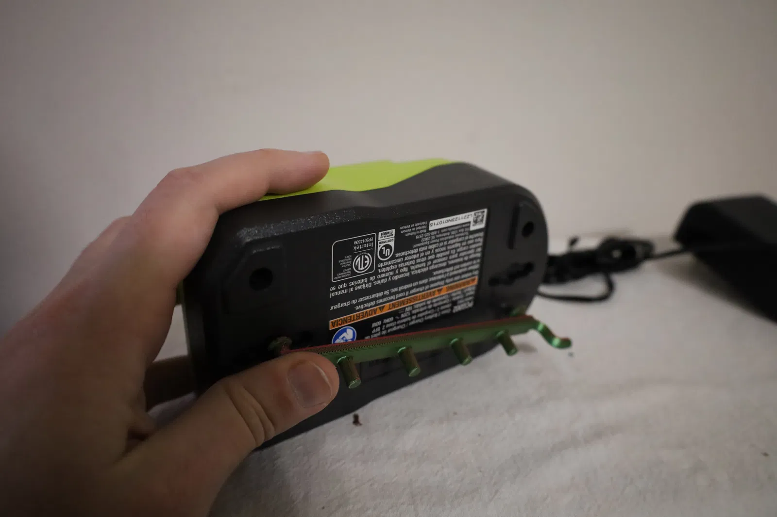 Phần này sẽ gắn vừa vào pegboard kiểu Mỹ (1in x 1in) và có hai chốt ở phía đối diện để khớp vào các lỗ gắn ở đáy sạc pin Ryobi 18V. Món này in ra thành một khối duy nhất và không cần thêm bất kỳ ốc vít hay bộ phận nào khác. Sản phẩm được làm để vừa khít và ép chặt vào các lỗ trên sạc pin, nên bạn sẽ cần dùng lực mạnh để gắn nó vào vị trí.