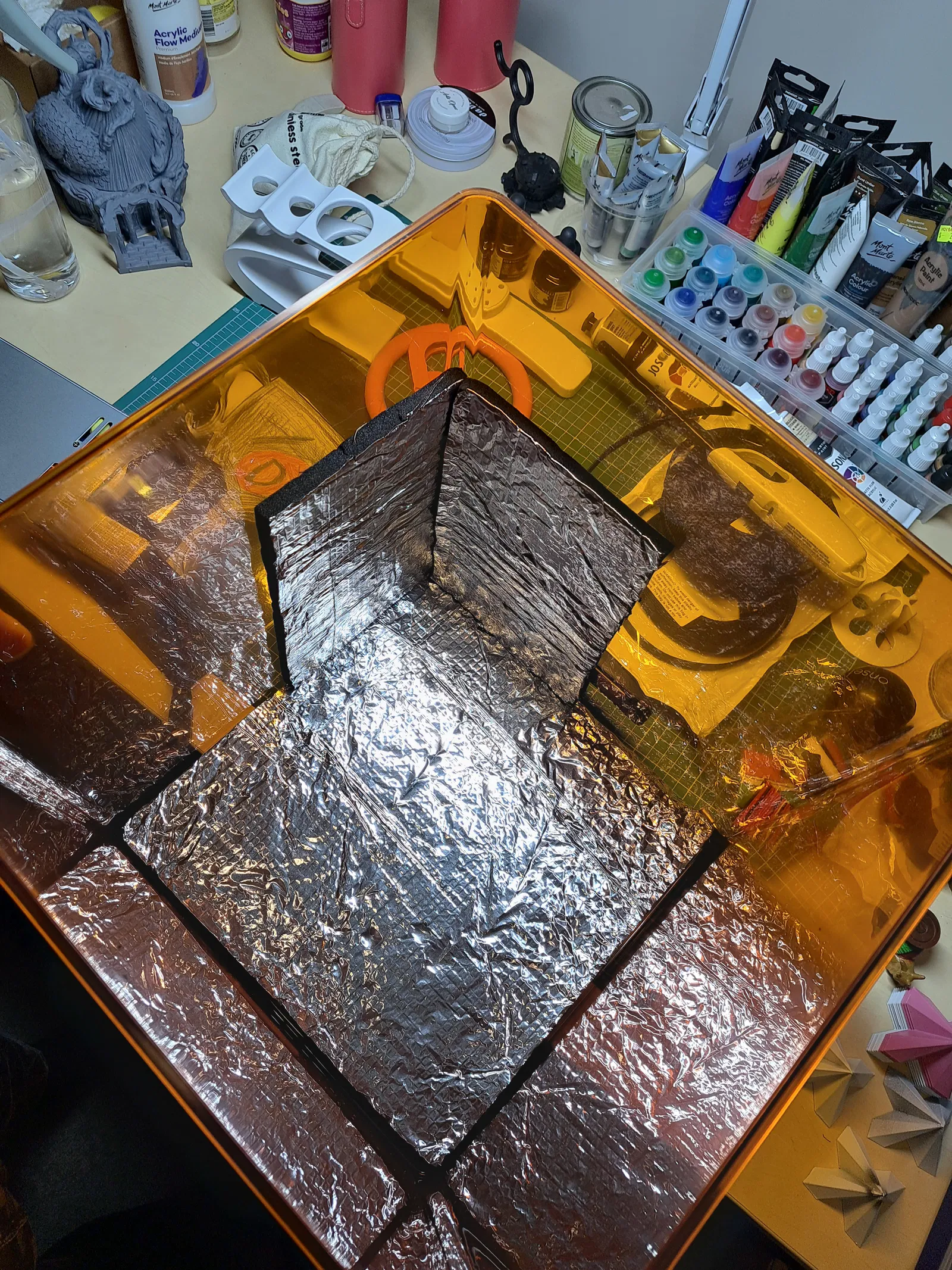 - Dán hai nửa này sát vào góc và với tấm đầu tiên tương đối với vị trí của bộ sưởi, điều này sẽ ngăn nắp bị nóng và phân tán/phản xạ nhiệt tốt hơn, sử dụng ít năng lượng hơn cũng như đạt được nhiệt độ mục tiêu nhanh hơn.