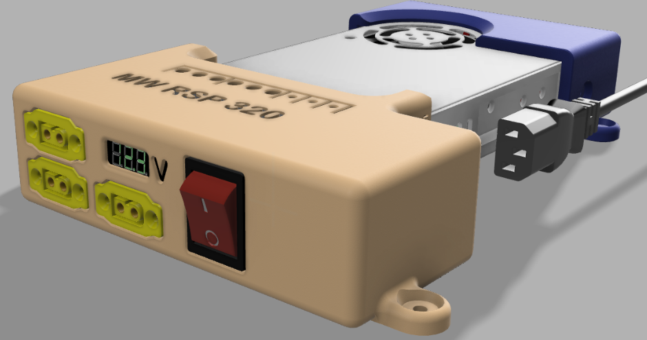 Giá đỡ nguồn Meanwell RSP-320 (các phiên bản từ 12V đến 48V) với các đầu nối XT60 cho ổ cắm và bộ giảm căng cáp cho dây nguồn.
