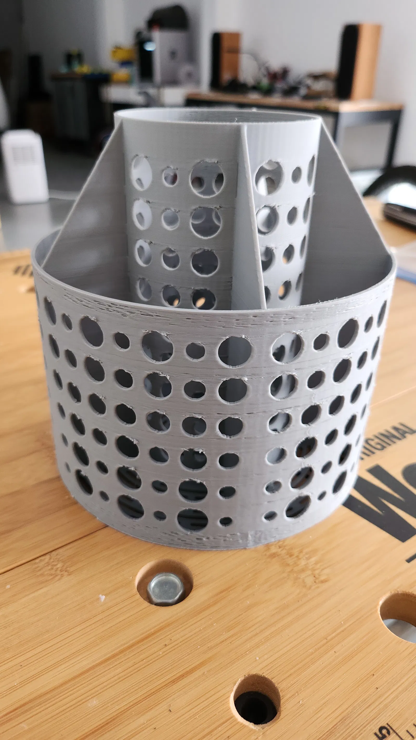 Giá phơi dụng cụ có thể tùy chỉnh hoàn toàn, rất được lòng các thành viên gia đình. Thiết kế này sử dụng vòng tròn để in nhanh hơn và cho phép các bức tường mỏng hơn. Tệp STL có sẵn tại đây, nhưng bạn có thể tìm mã scad đầy đủ tùy chỉnh tại các trang khác.
