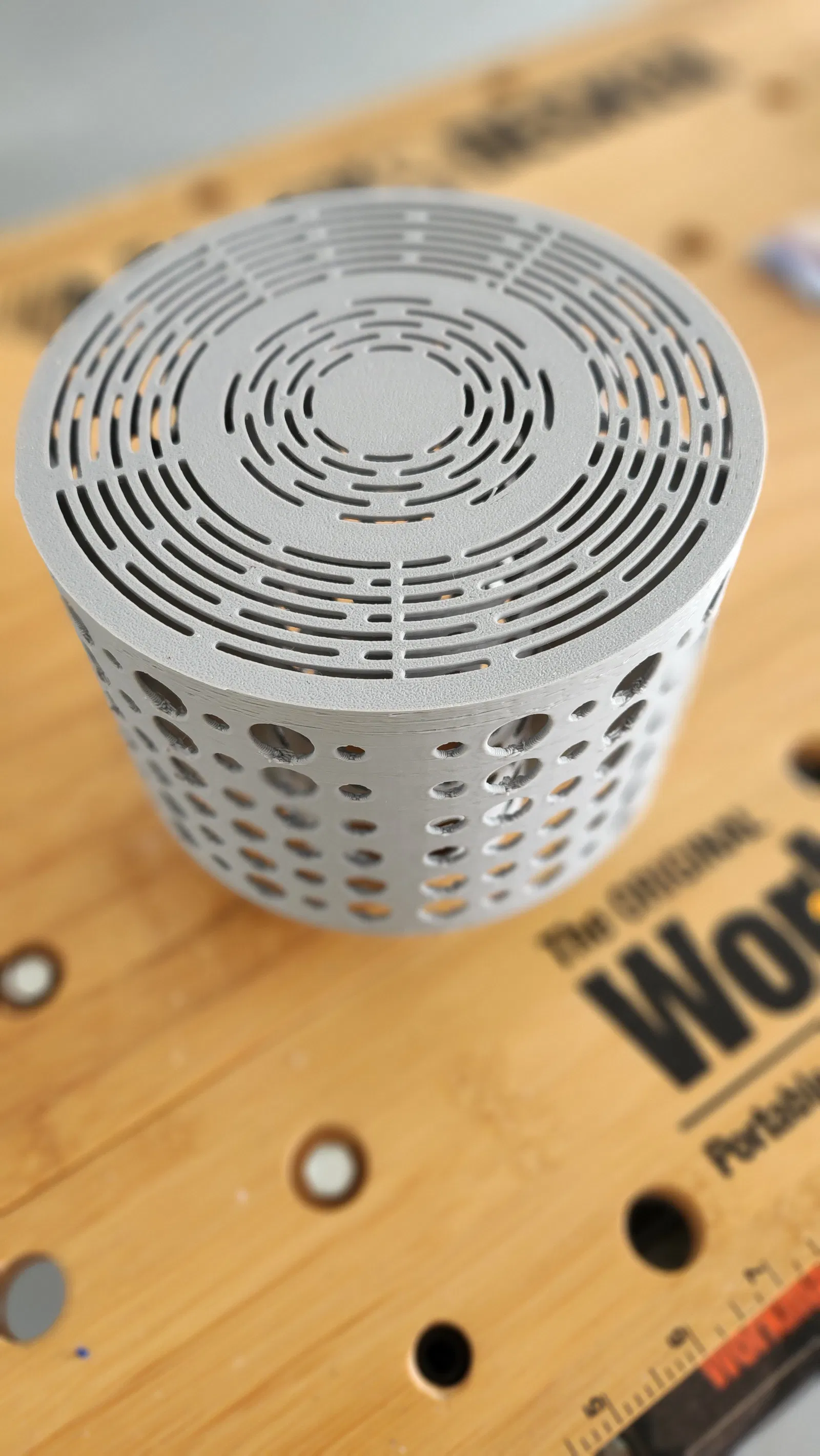 Đây là bản phối lại của giá phơi tôi đã thiết kế trước đó. Sử dụng vòng tròn thay vì các lỗ hình lục giác giúp in nhanh hơn và cho phép các bức tường mỏng hơn. Chiếc trong ảnh (và mặc định trong trình tùy chỉnh) có các bức tường dày 1,6 mm, và có thể còn mỏng hơn.