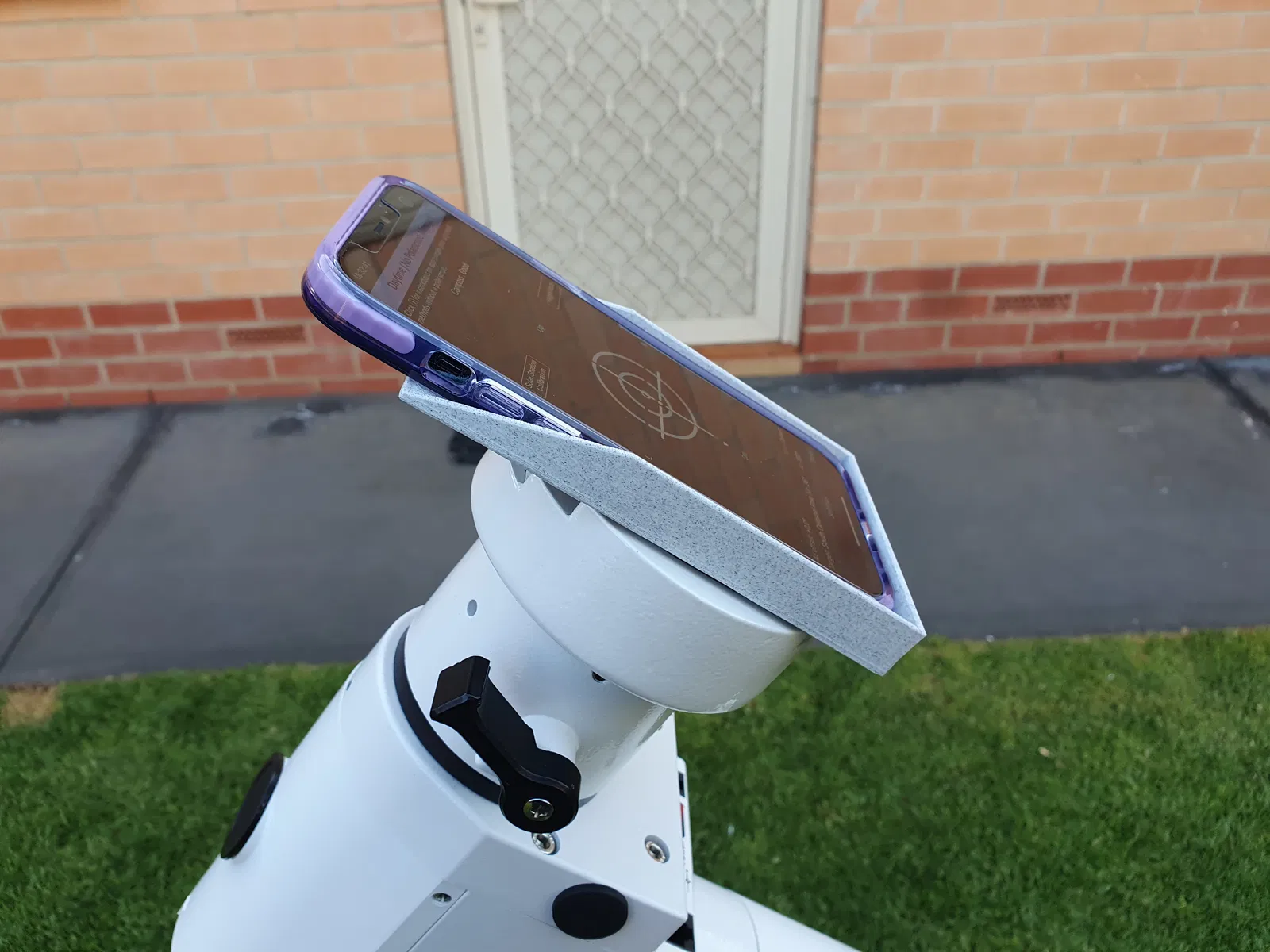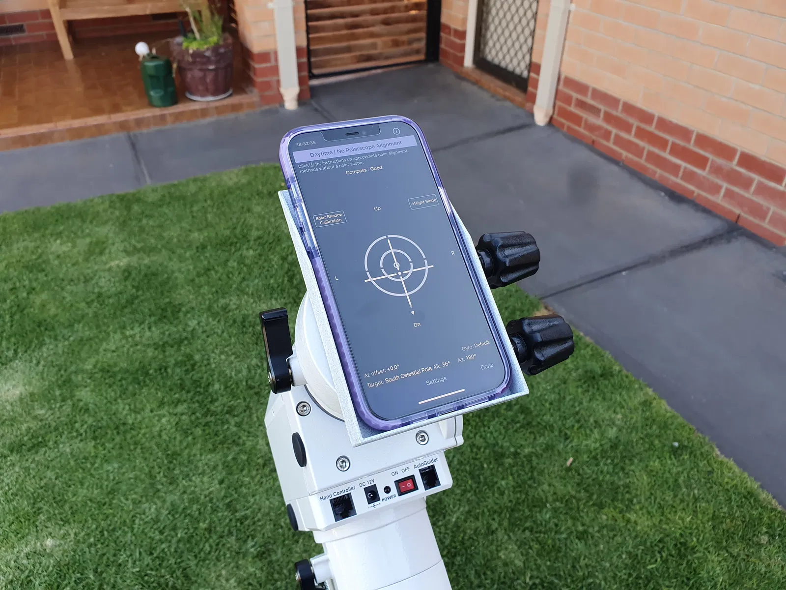 Nói chung, căn chỉnh cực (polar alignment) cực kỳ quan trọng trong thiên văn học và chụp ảnh thiên văn vì nó cho phép bạn chống lại chuyển động tự nhiên của trái đất, điều này rất cần thiết cho việc theo dõi và chụp ảnh. Trong một số trường hợp, ví dụ như vào ban ngày, không thể căn chỉnh cực bằng sao Bắc Đẩu (Polaris) được. Đây là lúc các ứng dụng như PS Align hữu ích, vì chúng cho phép bạn sử dụng GPS và la bàn tích hợp trên điện thoại để căn chỉnh cực sơ bộ kính thiên văn với một mức độ chính xác nhất định. Cái khay này cho phép bạn gắn điện thoại của mình vào kính thiên văn để dễ dàng căn chỉnh cực.