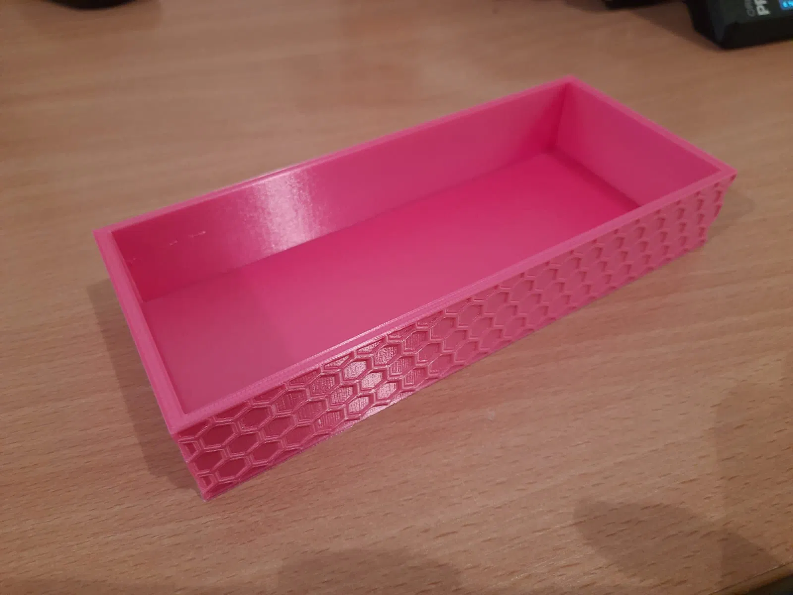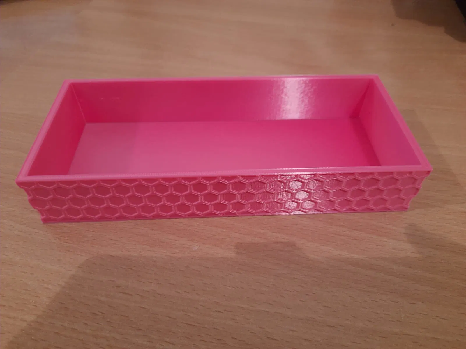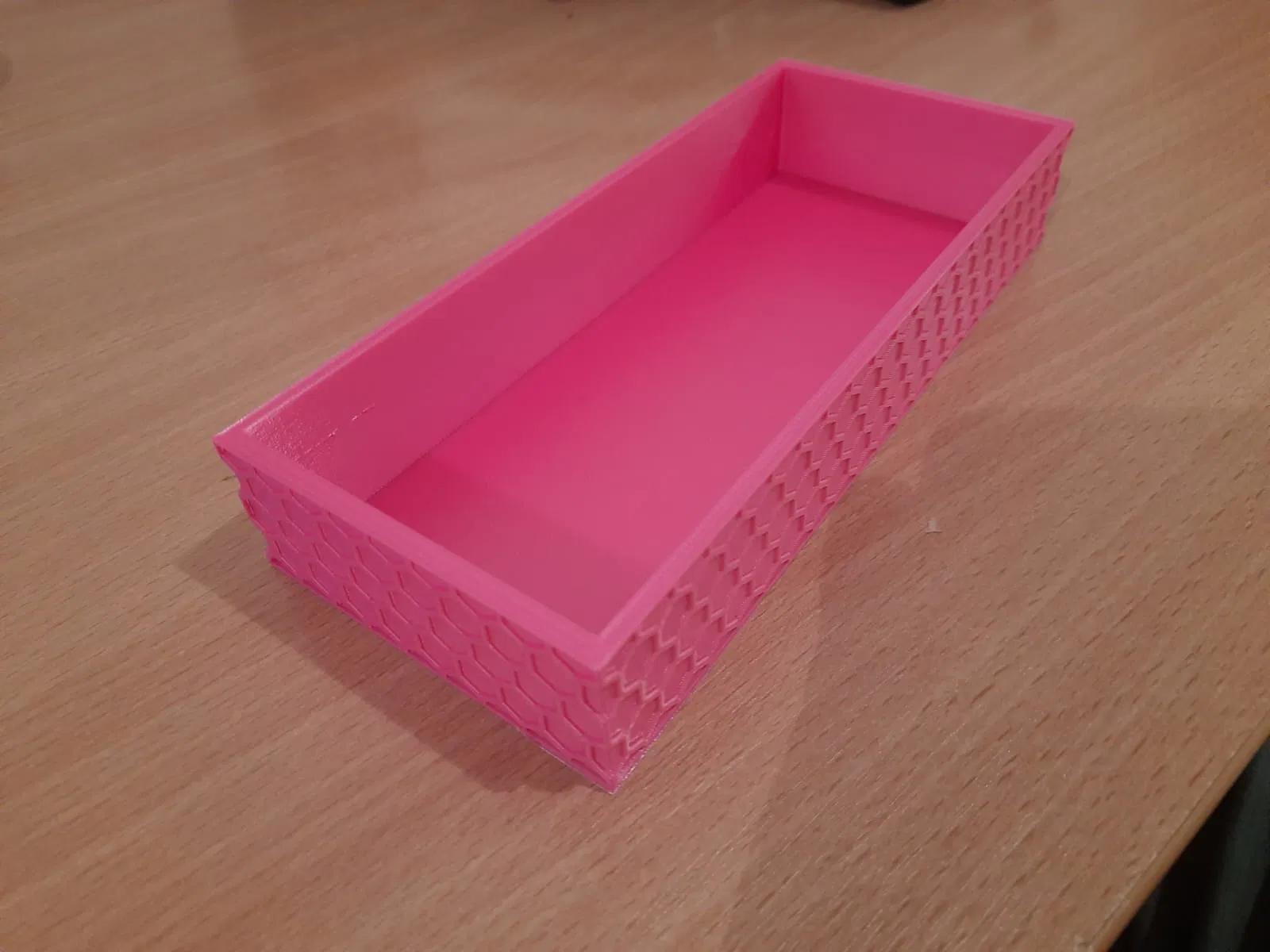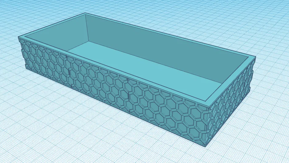 Một cái hộp đơn giản, có hoa văn hình tổ ong nhìn độc đáo. Thích hợp để đựng đồ linh tinh hoặc làm vật trang trí. Thiết kế này không quá phức tạp, phù hợp với nhiều mục đích sử dụng khác nhau.