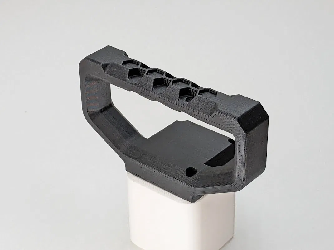Tay cầm Bambu A1 MINI với thiết kế hoa văn lục giác độc đáo, mang lại vẻ ngoài hiện đại và chắc chắn. Dễ dàng lắp đặt bằng cách thay thế nắp trục Z và sử dụng ốc có sẵn. Cần có support khi in.
