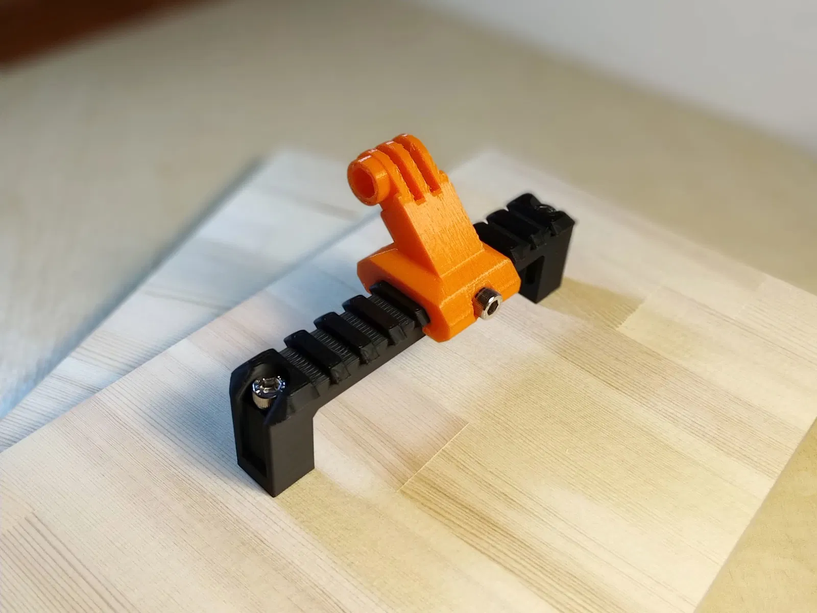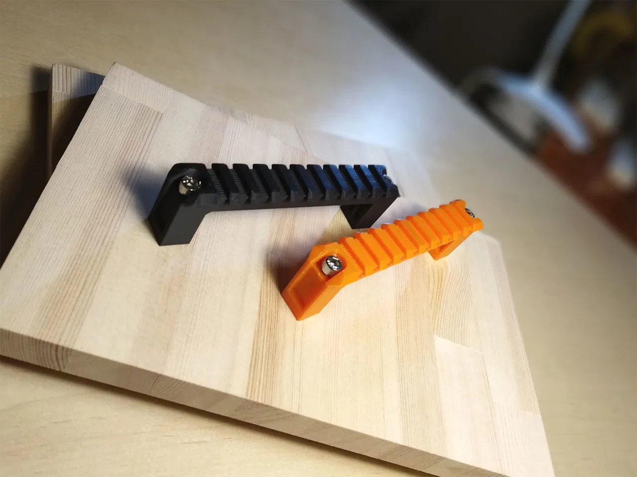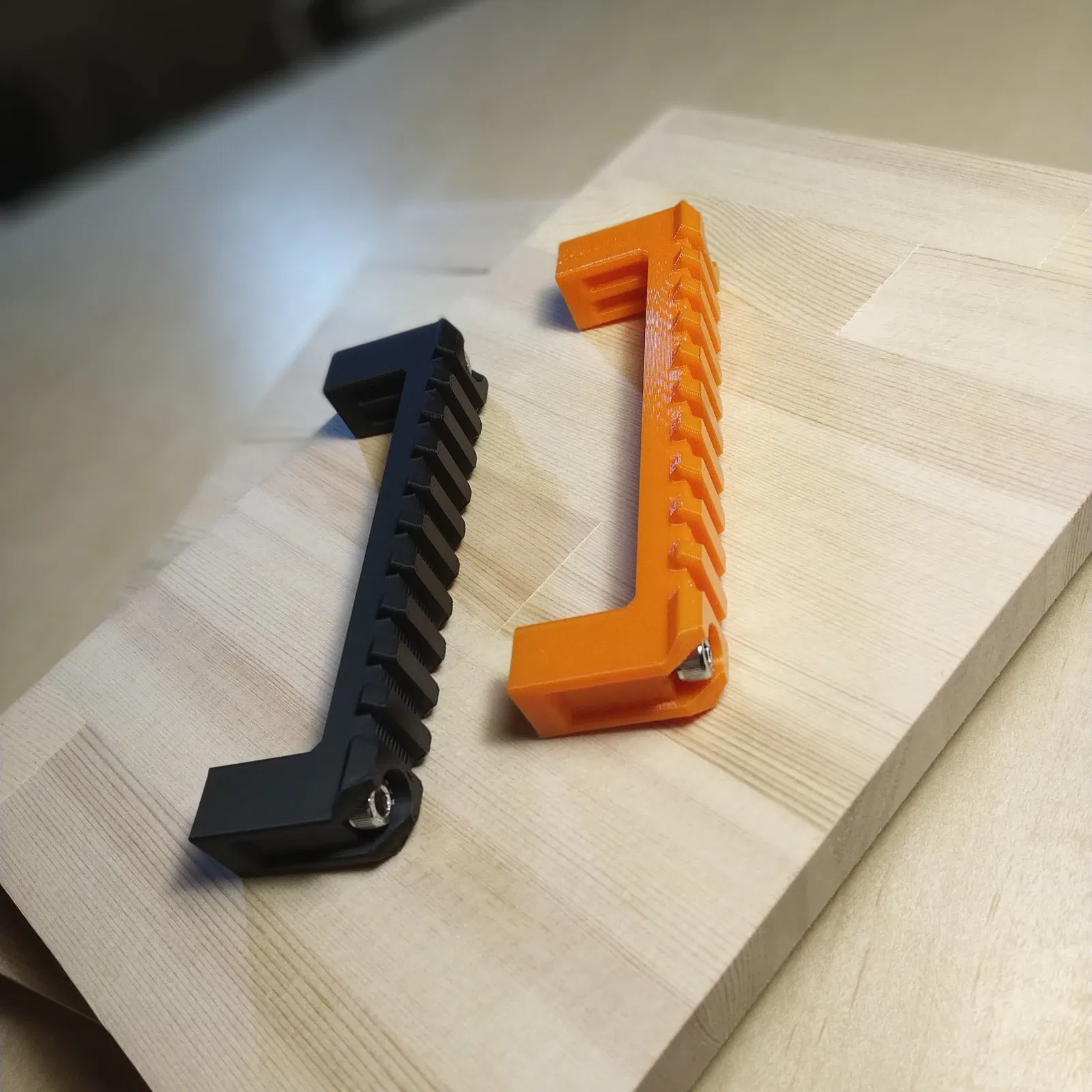 Tay nắm ngăn kéo kiểu ray Picatinny này có thiết kế hầm hố, "ngầu" khỏi bàn. Bạn chỉ cần dùng hai con vít để gắn là xong, không cần support gì hết. Chất liệu PLA, độ dày lớp 0.30mm, độ dày tường 3, ruột 20%.