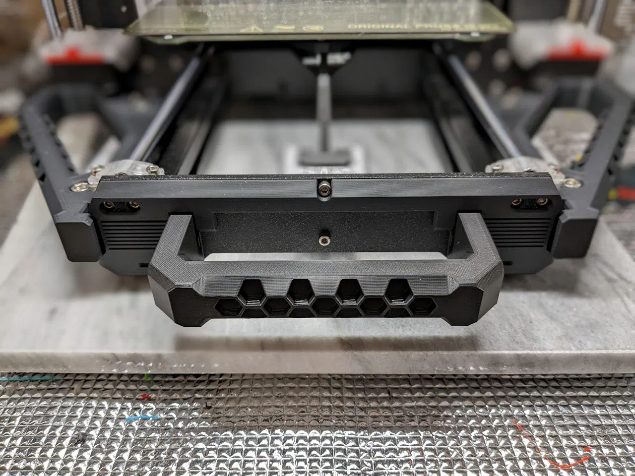 Tay cầm có họa tiết lục giác, gắn vào máy in Prusa MK3. Phù hợp khi bạn cần kéo máy in ra khỏi vỏ hoặc mang đi. Lắp đặt đơn giản, chỉ cần ốc và đai ốc M3.