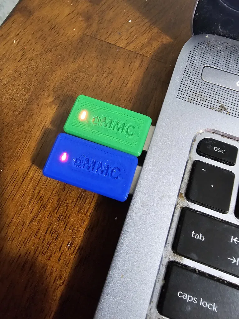 Cái vỏ này dùng để gắn bo mạch chuyển đổi USB sang eMMC. Vỏ được thiết kế để gài lại với nhau, có thể điều chỉnh nếu bo mạch chưa vừa. Nó phù hợp cho cả cổng USB xếp chồng và đặt cạnh nhau. Chất liệu đa dạng, từ ABS tái chế đến PLA.