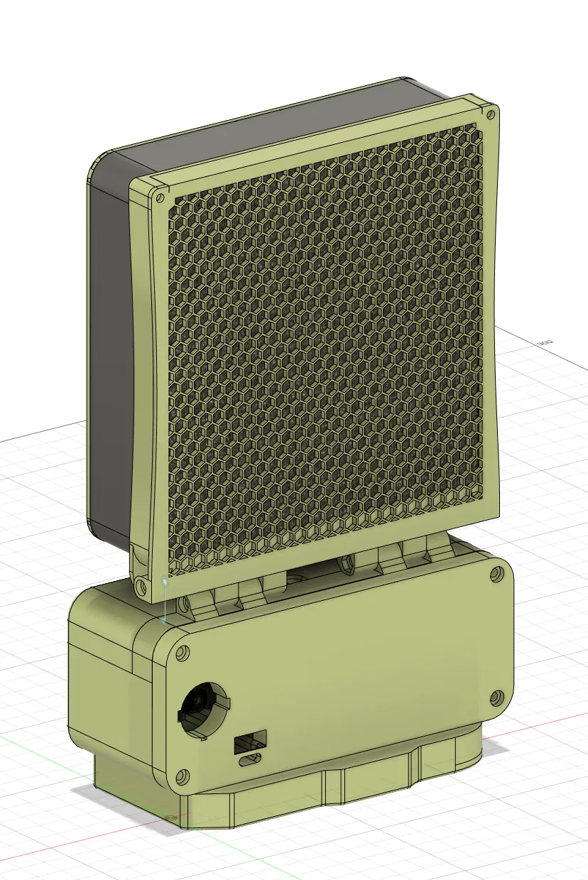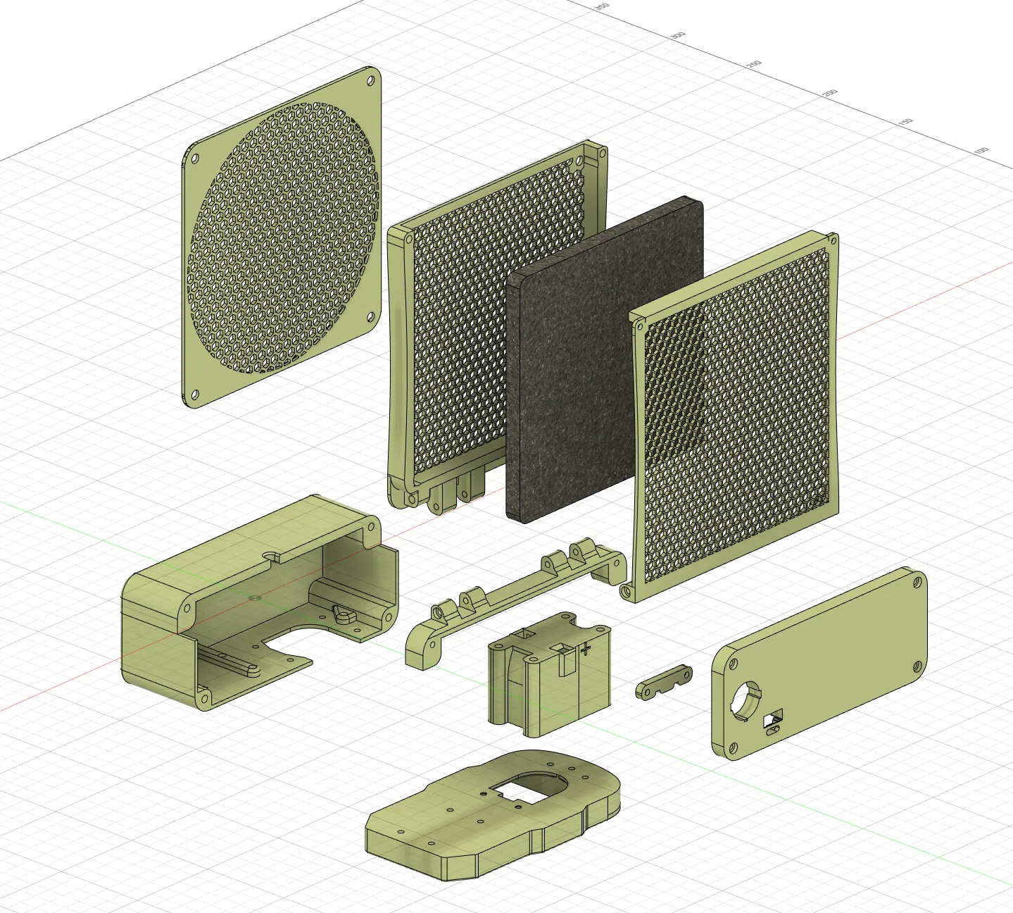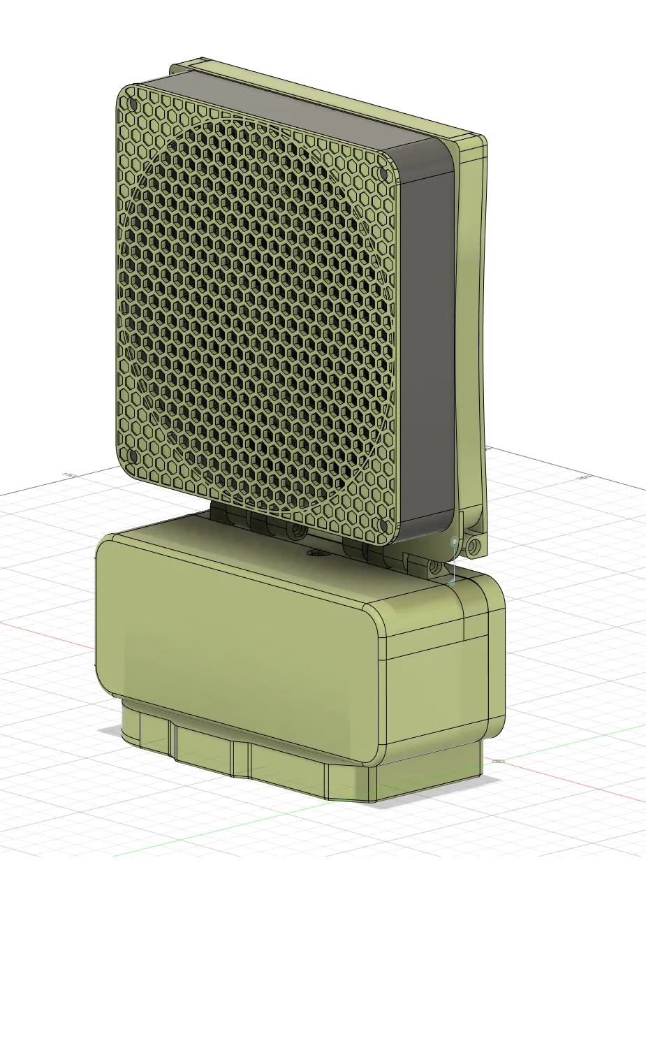 Chế tạo máy hút khói hàn di động với nguồn USB PD cho mỏ hàn, sử dụng pin Ryobi ONE+ 18V. Bao gồm bộ lọc carbon, quạt 140mm và bộ chuyển đổi DC-DC. Thiết kế độc đáo với lưới lục giác và bản lề xoay.