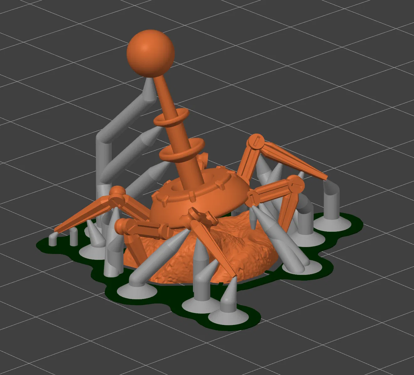 Đây là mẫu proxy của mình cho Frosthaven Summons, Arcing Generator! Trông nó như một con robot bò lổm ngổm với cái que to đùng trên đầu, chỗ đó có thể phóng ra tia điện đó. Hình gốc của con summon này bạn có thể xem ở https://github.com/any2cards/frosthaven/blob/master/images/art/frosthaven/characters/summons/fh-summon-arcing-generator-front.png. Mình chọn sơn em nó hơi khác một chút, xen kẽ giữa mấy cái vòng đồng với phần khung màu xám súng để cho nó nổi bật hơn, chứ sơn một màu nhìn trên bàn chơi chán lắm.