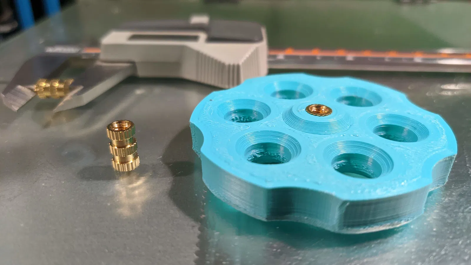 Ép cái lẫy ren vô cái núm in ra trước khi lấy ra khỏi bàn in nha.