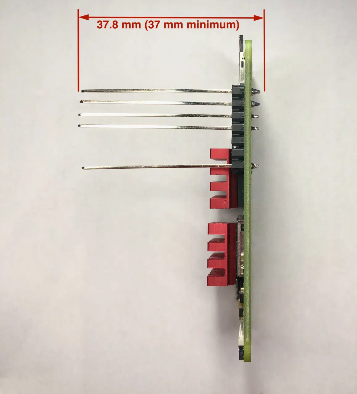Vui lòng làm theo hướng dẫn chính thức của Prusa tại https://help.prusa3d.com/guide/prusalink-and-prusa-connect-setup-for-mk3-s-_221744 để học cách chuẩn bị chân cắm pin và làm một bộ, chú ý kỹ đến vị trí các chân pin. Điểm khác biệt duy nhất là chúng ta sử dụng các chân pin dài hơn, 37.8 mm thay vì loại 18 mm. Nếu bạn đang di chuyển từ giải pháp ban đầu và đã hàn các chân ngắn hơn vào Pi của mình, bạn sẽ phải hàn chúng ra một cách cẩn thận trước. Việc này có thể khó khăn và bạn phải hết sức cẩn thận để không làm bong tróc hoặc làm hỏng các mối hàn, nhưng với một chút kiên nhẫn, nhiều flux, dây hàn nhả và/hoặc súng hàn nhả, bạn có thể làm thành công. Nếu không chắc, hãy giao việc này cho người bạn am hiểu về điện tử của bạn vì chúng ta không muốn làm hỏng bo mạch Raspi quý giá này ;-) Nếu mọi thứ được thực hiện đúng cách, bạn sẽ có kết quả giống như trên ảnh.