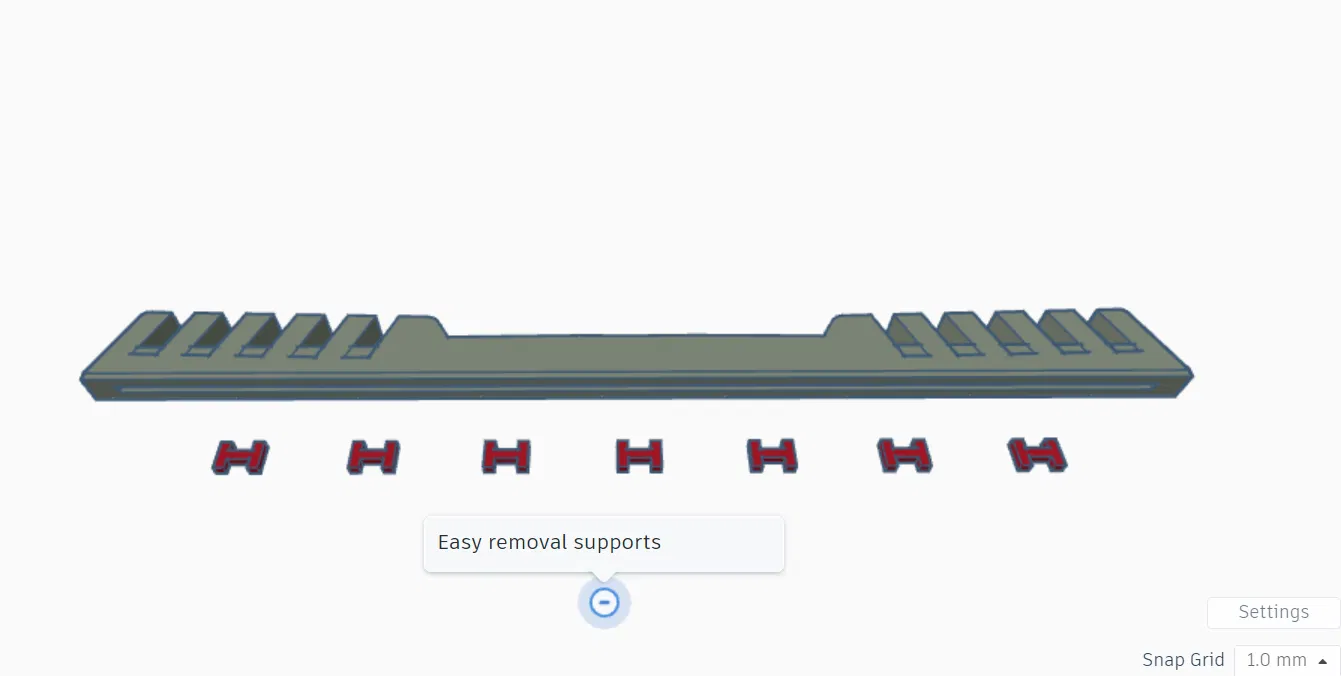 KHÔNG CẦN SUPPORT! Cái này sử dụng mấy cái 'H' nhỏ xíu rất dễ dàng rút ra bằng kềm. Miễn là máy in của anh em có thể bridge được 15mm trở xuống là được!