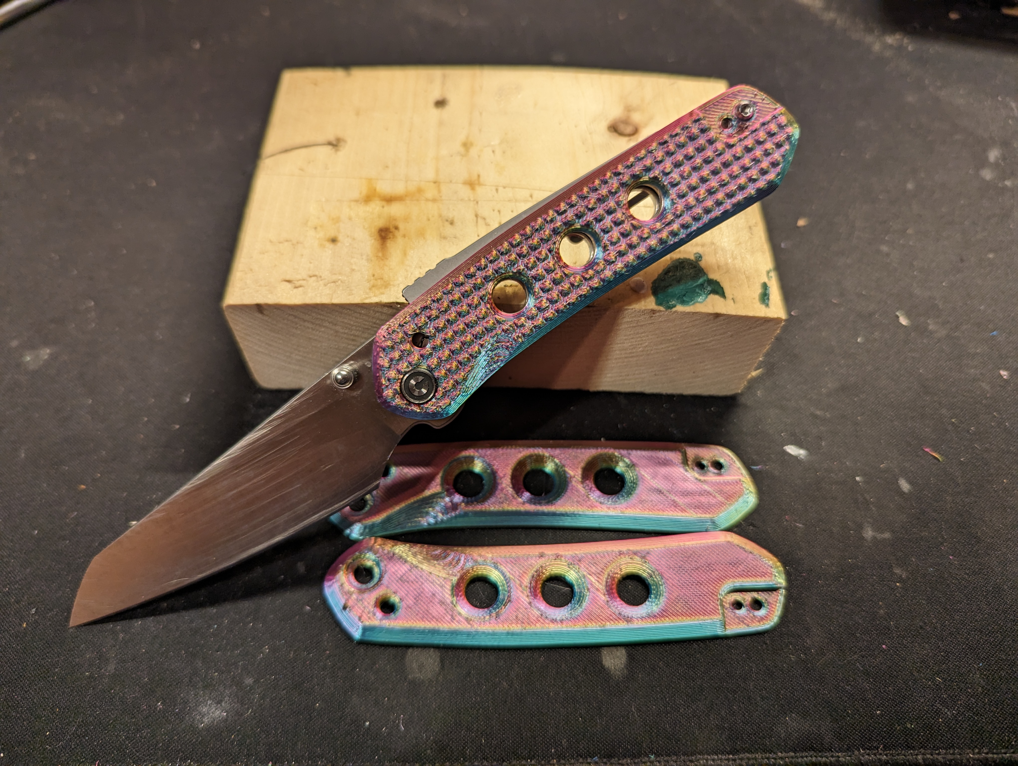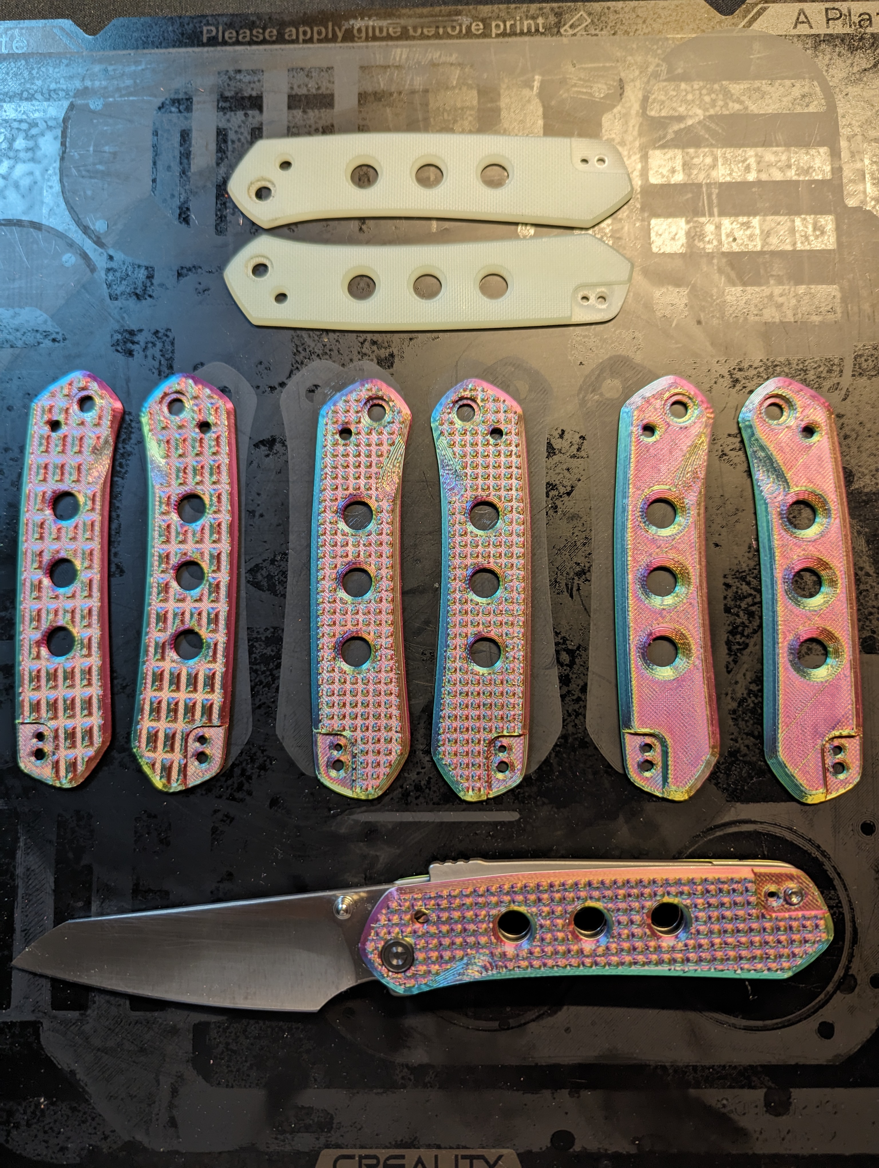 Đây là bộ ốp lưng (scales) mình đã thiết kế cho con dao Civivi Vision FG. Mình làm 2 loại: loại trơn và loại có họa tiết lưới để tăng độ bám.