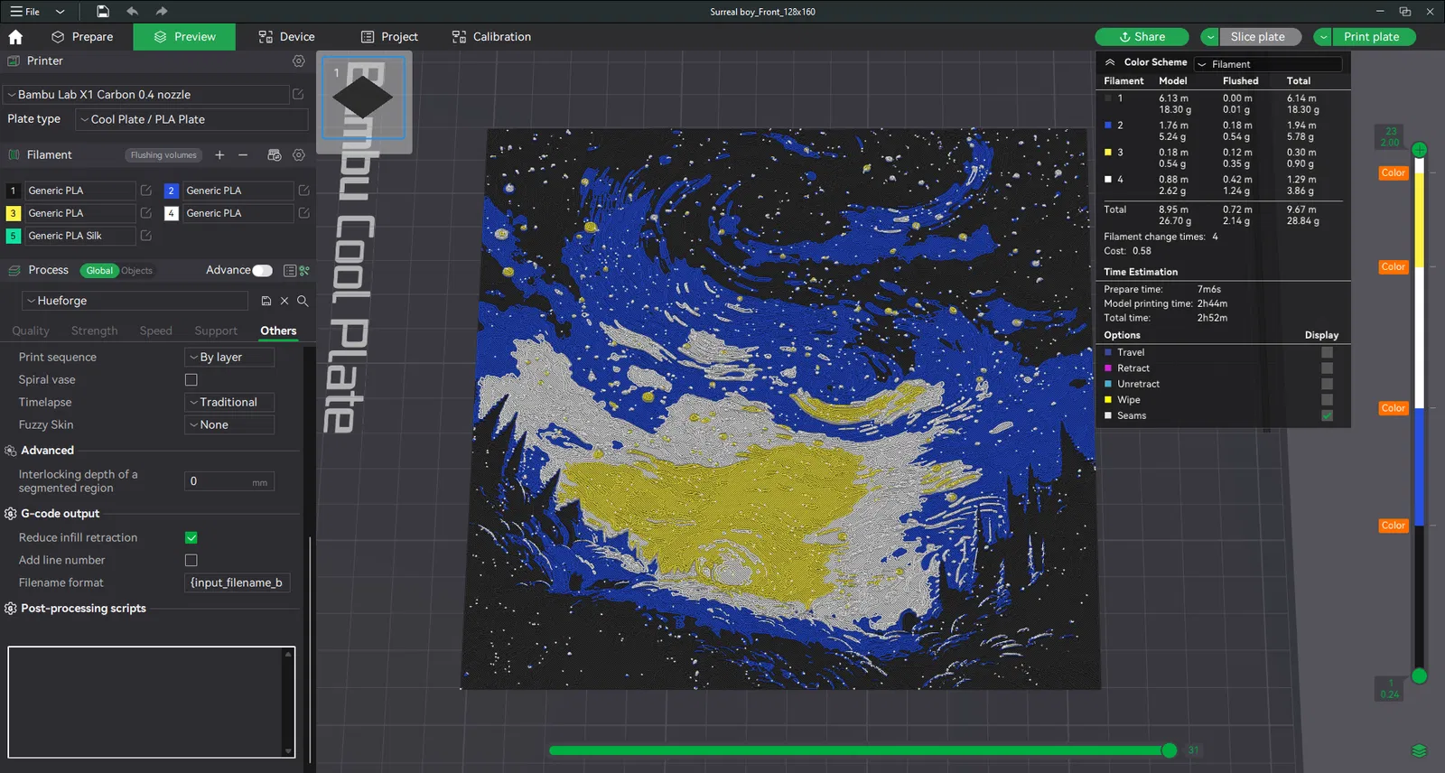 Hướng dẫn đổi màu: Bắt đầu với màu Đen Ở lớp thứ #7 (0.64mm) đổi sang màu Xanh dương Ở lớp thứ #12 (1.04mm) đổi sang màu Tự nhiên Ở lớp thứ #18 (1.52mm) đổi sang màu Vàng Ở lớp thứ #22 (1.84mm) đổi sang màu Tự nhiên cho đến hết.