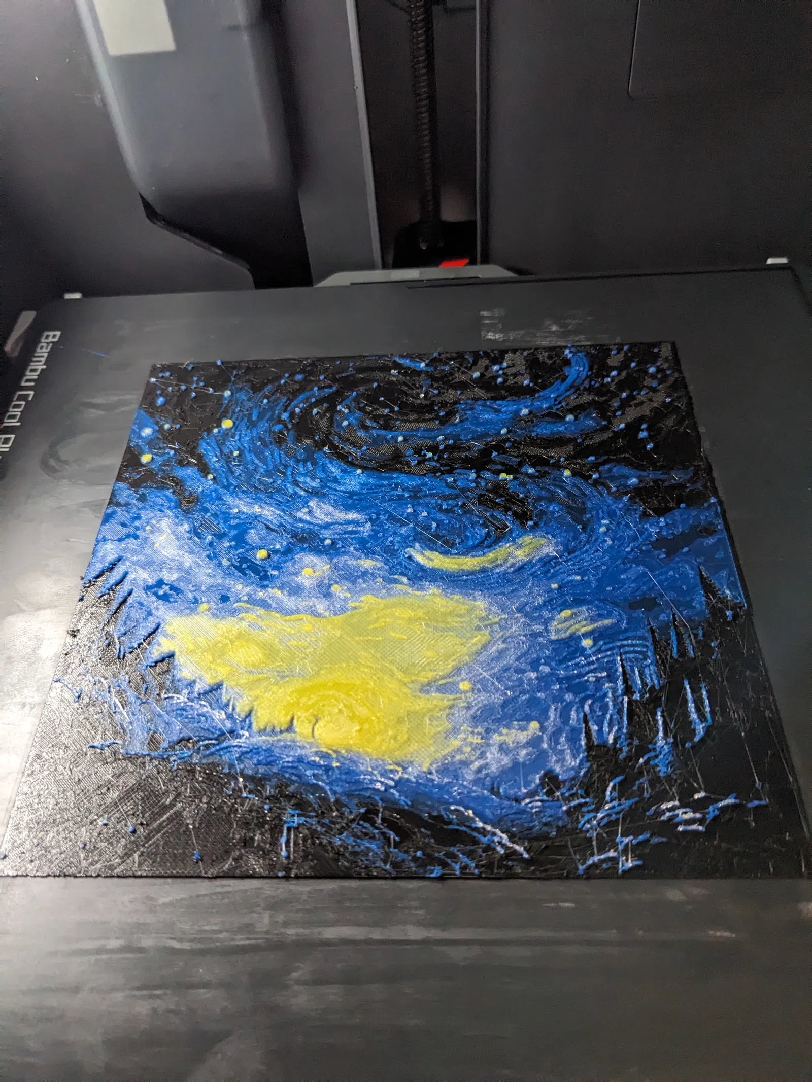 Chiêm ngưỡng "Đêm Đầy Sao" - một tác phẩm nghệ thuật 3D độc đáo được tạo ra từ Midjourney và HueForge. Hướng dẫn chi tiết sử dụng filament Inland và máy in Bambu Lab X1C cho bản in hoàn hảo.
