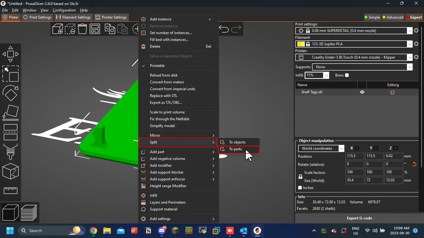 Khi đã tải vào eSlicer, đặt mô hình nằm phẳng trên mặt và nhấp chuột phải để mở menu. Có một tùy chọn để chia mô hình. Nhấp vào đó và chọn tùy chọn “Chia thành các phần”.