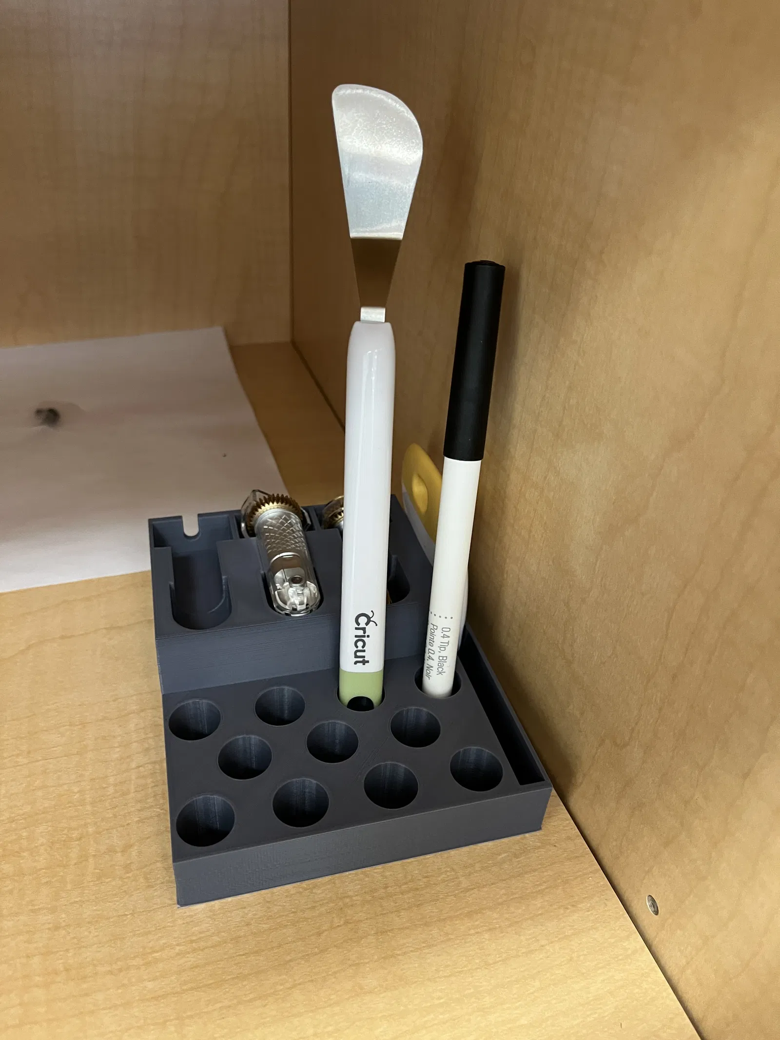 Bọn mình có cái máy Cricut Maker cho khách hàng tới tiệm mượn xài. Để tiện cho tụi mình đưa đồ nghề cho khách xài với cái máy Cricut, tụi mình quyết định tự làm cái kệ đựng đồ xịn sò bằng 3D print.