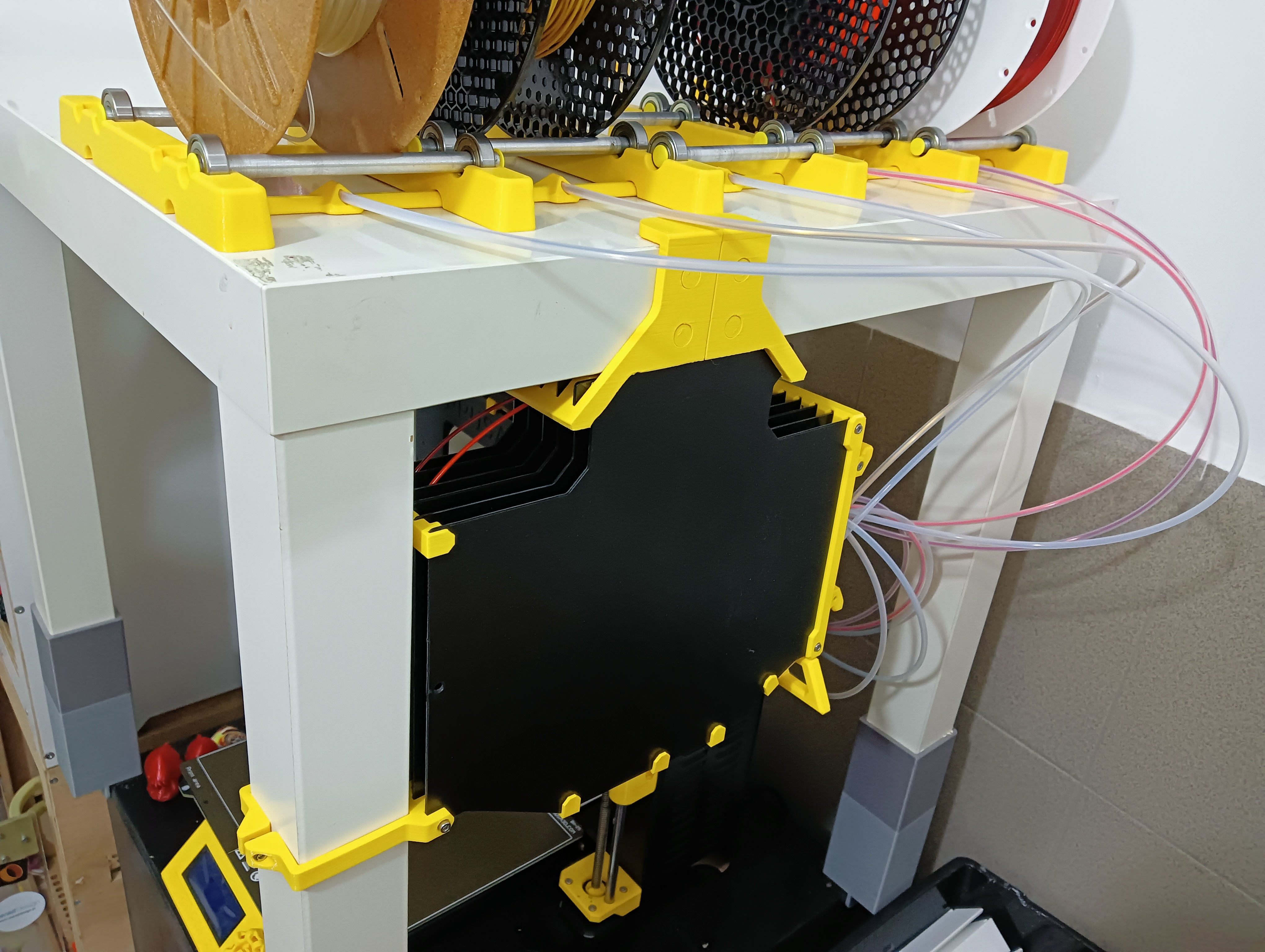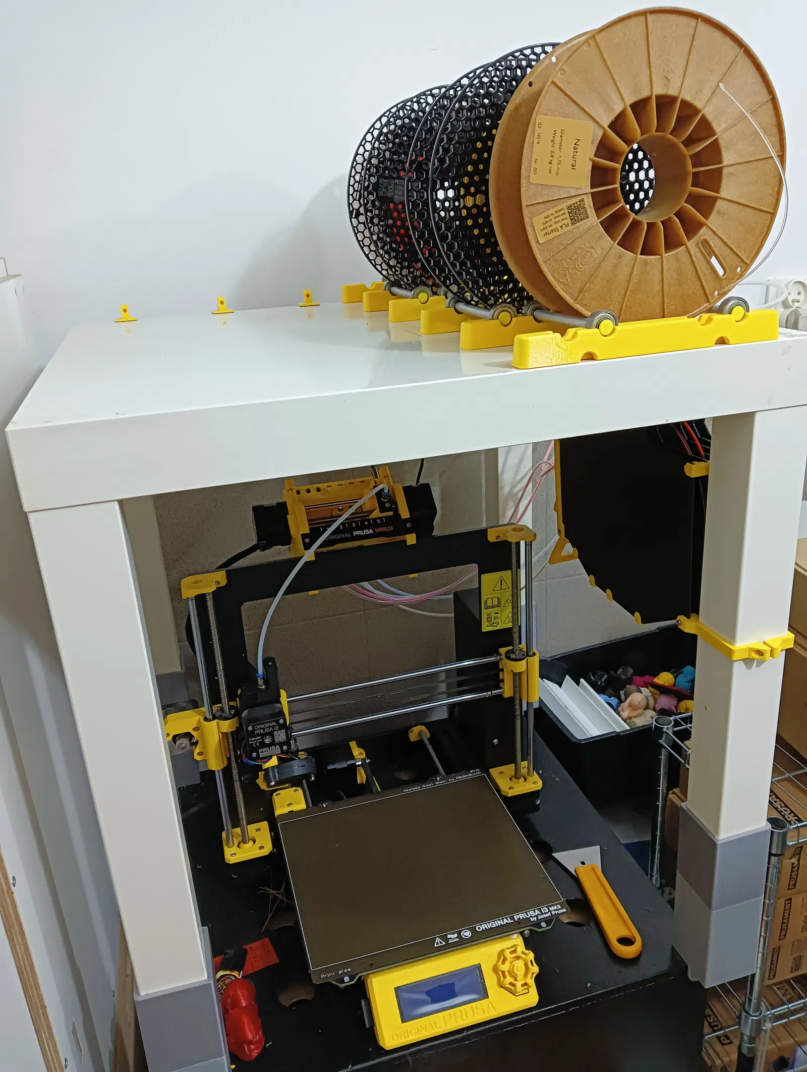Cái này là đế gắn cho cái hộp đa vật liệu Prusa MMU3, xài chung với bàn IKEA Lack là hết sẩy nha. In 2 cái UP3 là xài được. Có kèm link giá đỡ cuộn dây luôn.