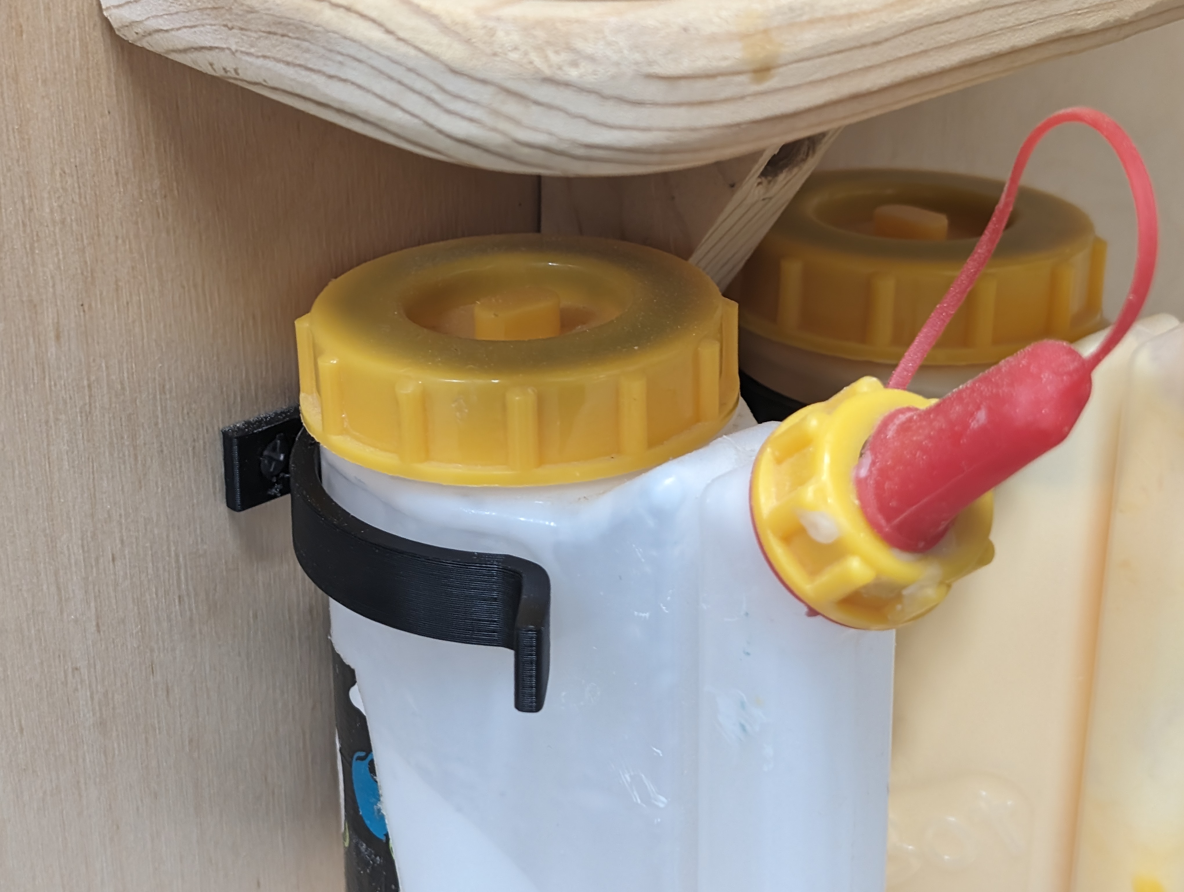 Giá đỡ kiểu kẹp để giữ chai keo Glubot trên tường dụng cụ. Dễ dàng gắn/tháo, chỉ cần 2 vít #6. In bằng PLA, không cần độ lấp đầy.