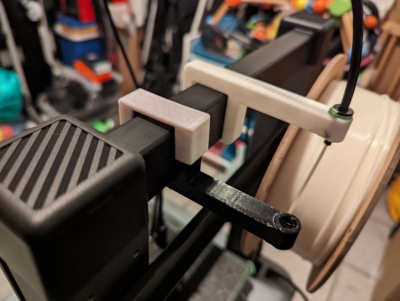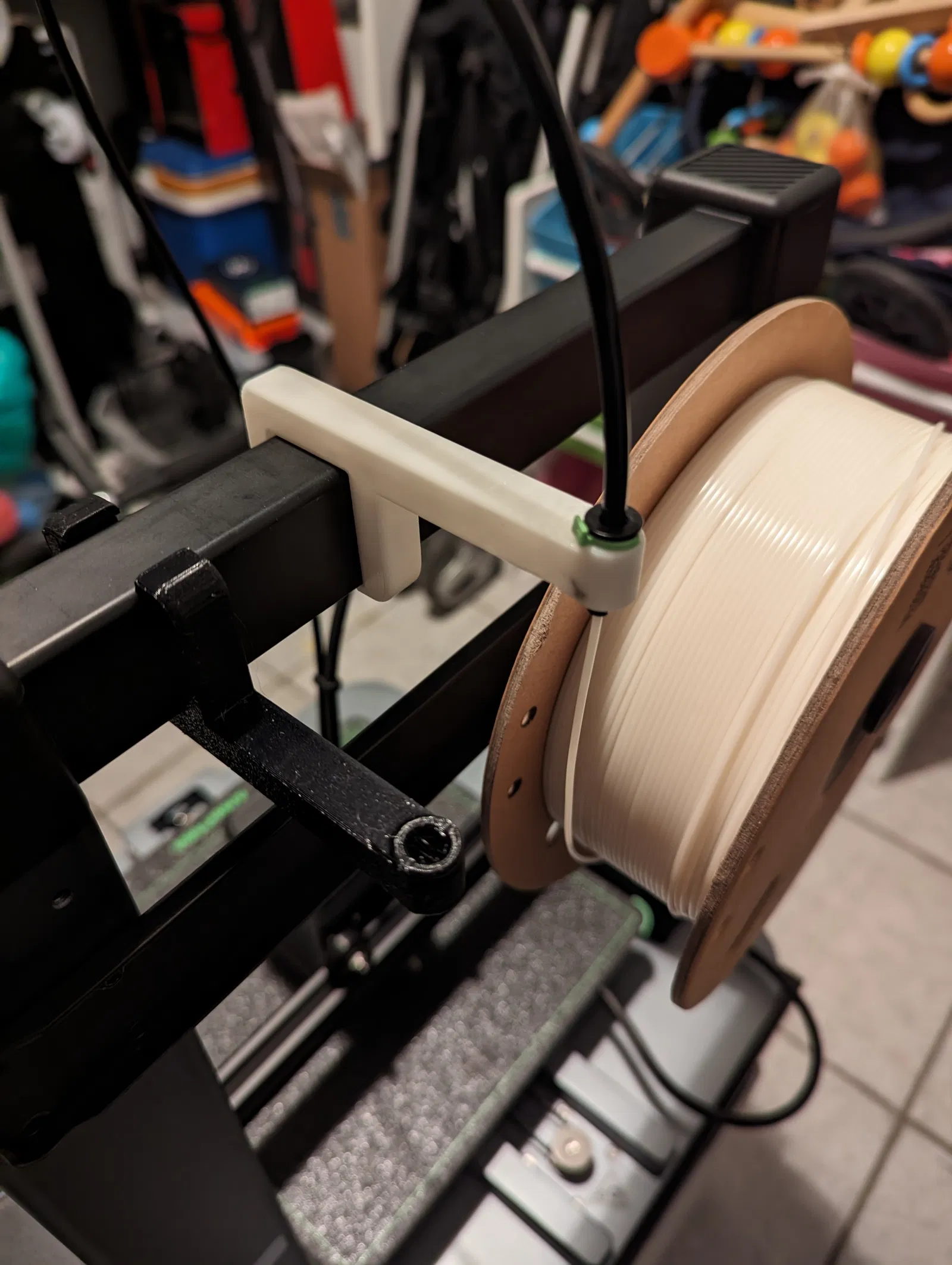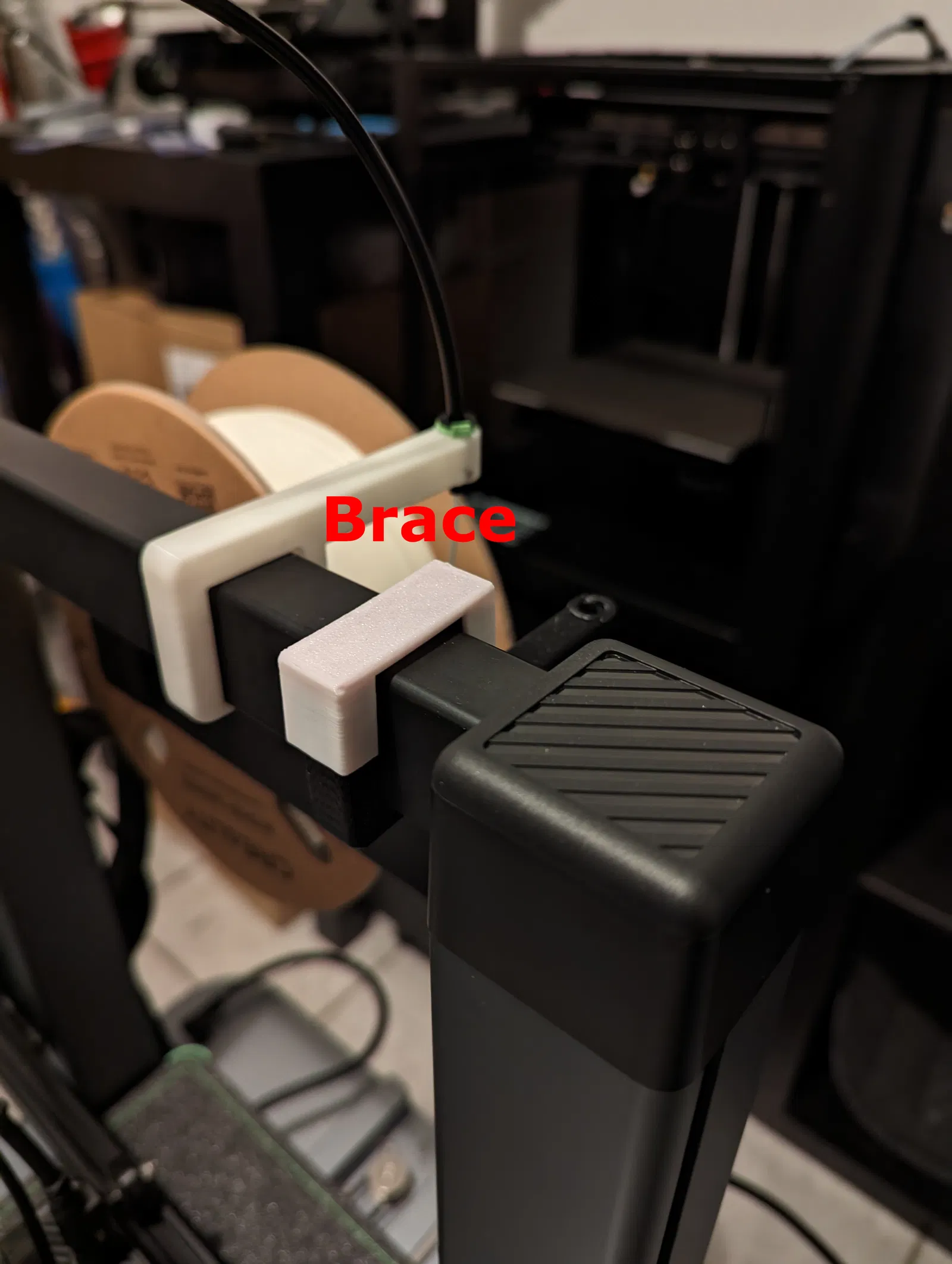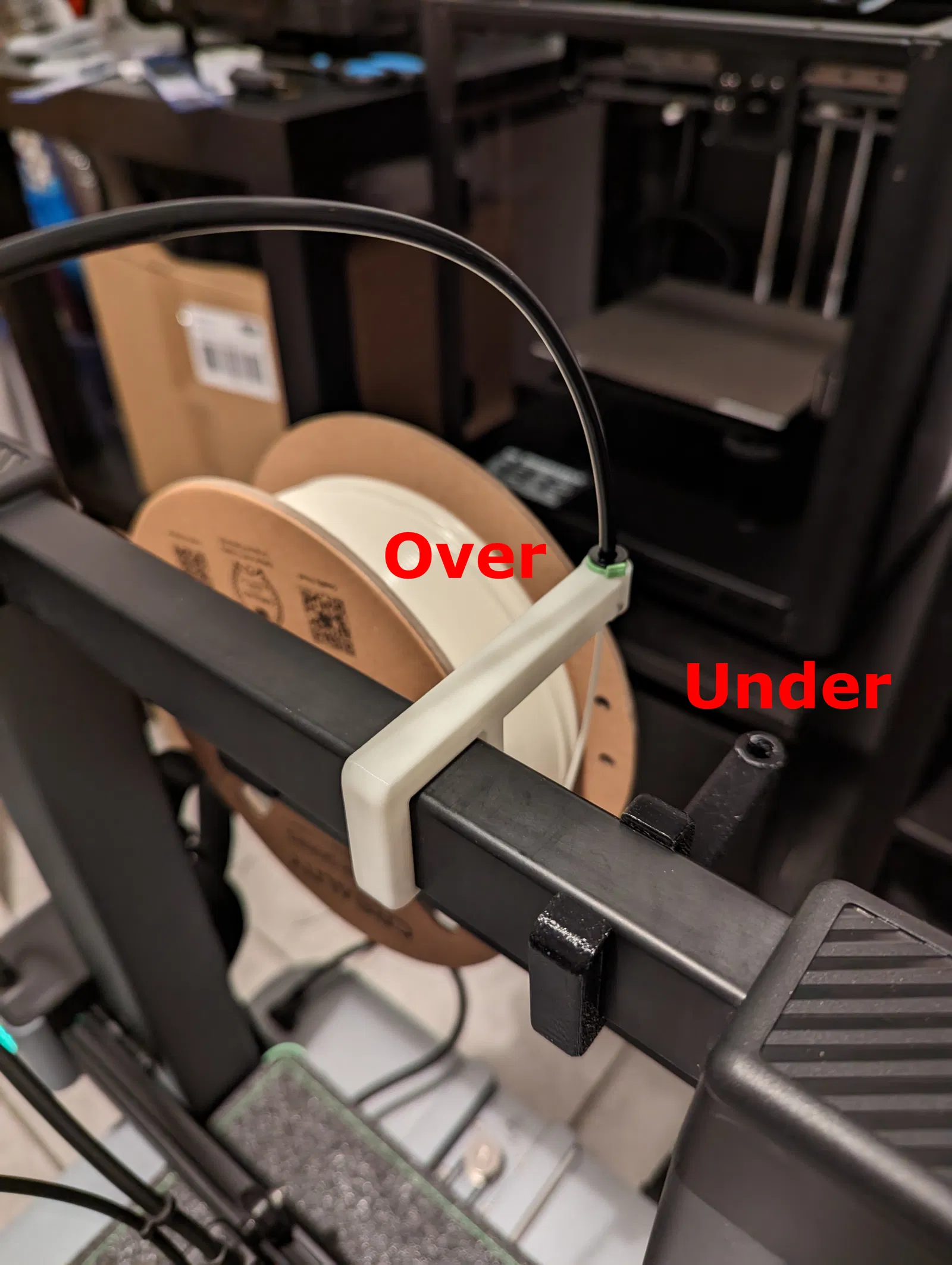 Có hai mẫu dẫn dây, một cái đi "lên trên" và một cái đi "xuống dưới" cái khung máy. Ống PTFE thì nhét vô cái lỗ trên, dây tóc thì nhét vô lỗ dưới, bạn có thể tái sử dụng cái kẹp/móc từ cái ống dẫn dây tóc đi kèm.