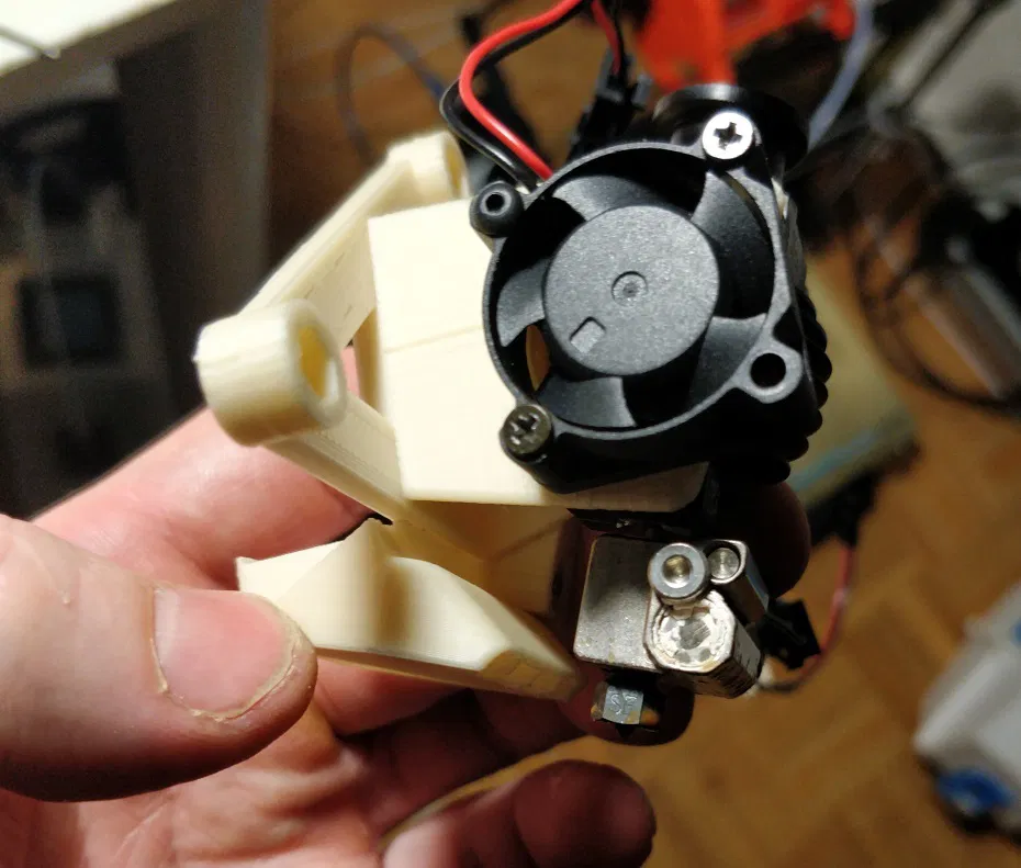 Tui mua cái Slice Engineering Copperhead cũng lâu rồi mà giờ mới gắn vô xài. Mà công nhận, phải có cái chụp quạt thổi tản nhiệt cho bộ phận nữa, mà tui tìm trên cái Tronxy X5S của tui không có cái nào ưng ý hết. Thôi thì kiếm đại một cái tui thấy tạm ổn để chế lại. Nhưng mà, vì không có cái để gắn nó vô, nên tui tự thiết kế thêm một cái khung để gắn vô cái hotend, rồi gắn cái chụp quạt lên cái khung đó bằng ốc M3 nha.