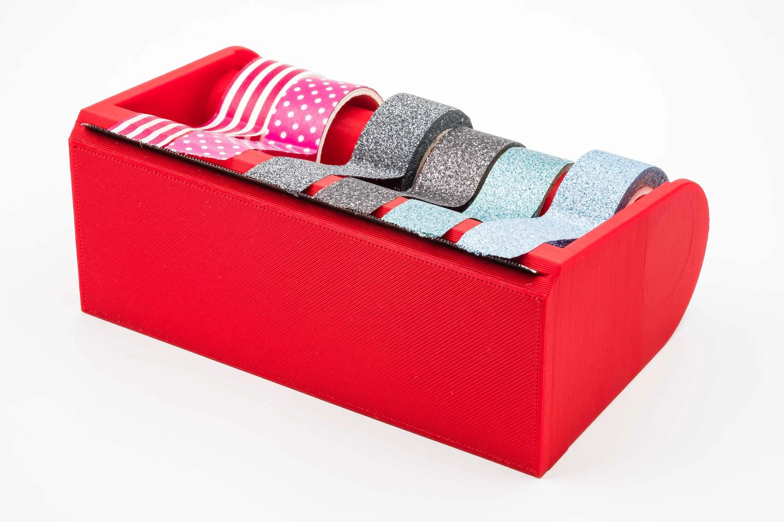 Kệ đựng băng keo đơn giản cho 6 đến 7 cuộn băng keo. In một lần, úp mặt xuống. Nên dùng "snug supports" trên mặt bàn in. Trục ø25 mm in "vase mode", lưỡi cưa kim loại 120 mm.