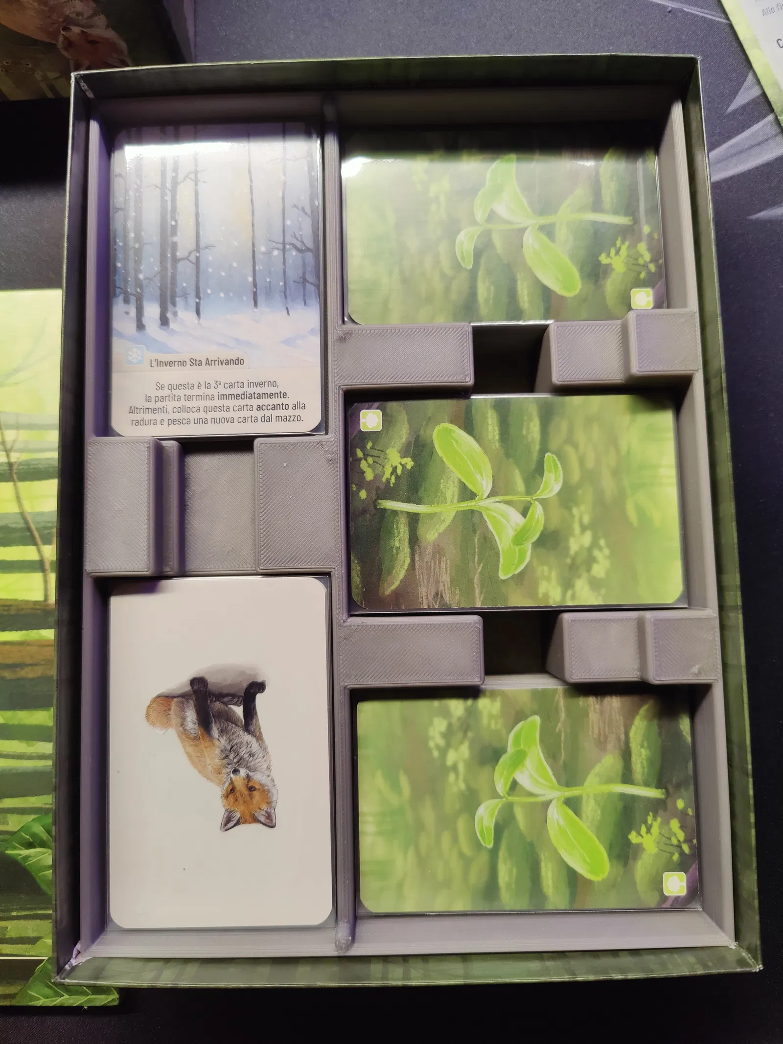 Với organizer này, bạn có thể chia bộ bài chính thành 3 phần, và các lá bài hướng dẫn, mùa đông/hang động cũng có chỗ riêng. Phía trên bạn có thể đặt dễ dàng cái bàn cờ để giữ nó an toàn và ổn định khi vận chuyển.