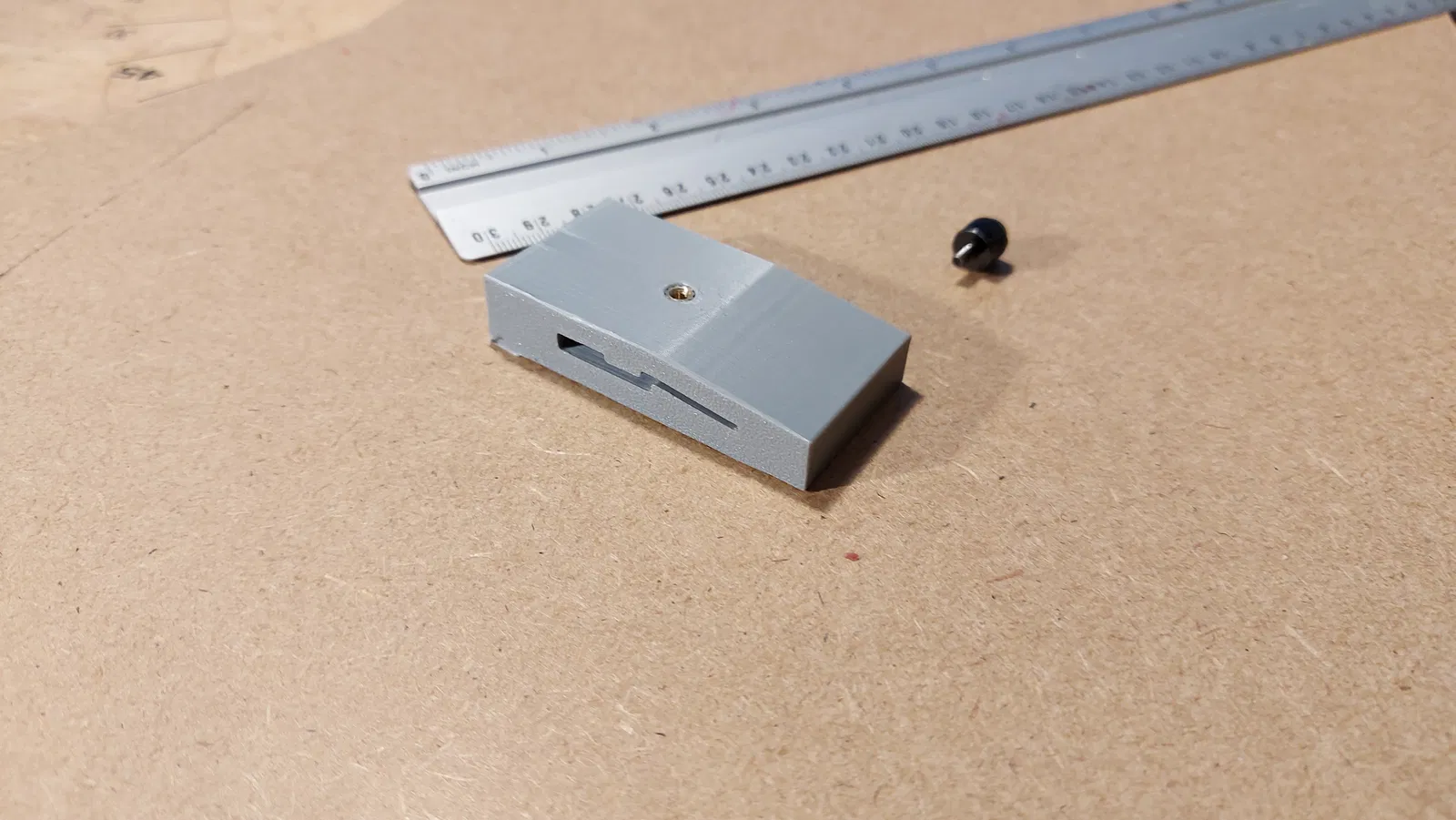 Cái này là dụng cụ chặn thợ mộc để kẻ đường song song cho cây thước kẻ Action Market nè. Có 2 loại, một loại đơn giản và một loại có rãnh sâu 7mm. Dùng ren chìm M3 và ốc vít máy tính nha.