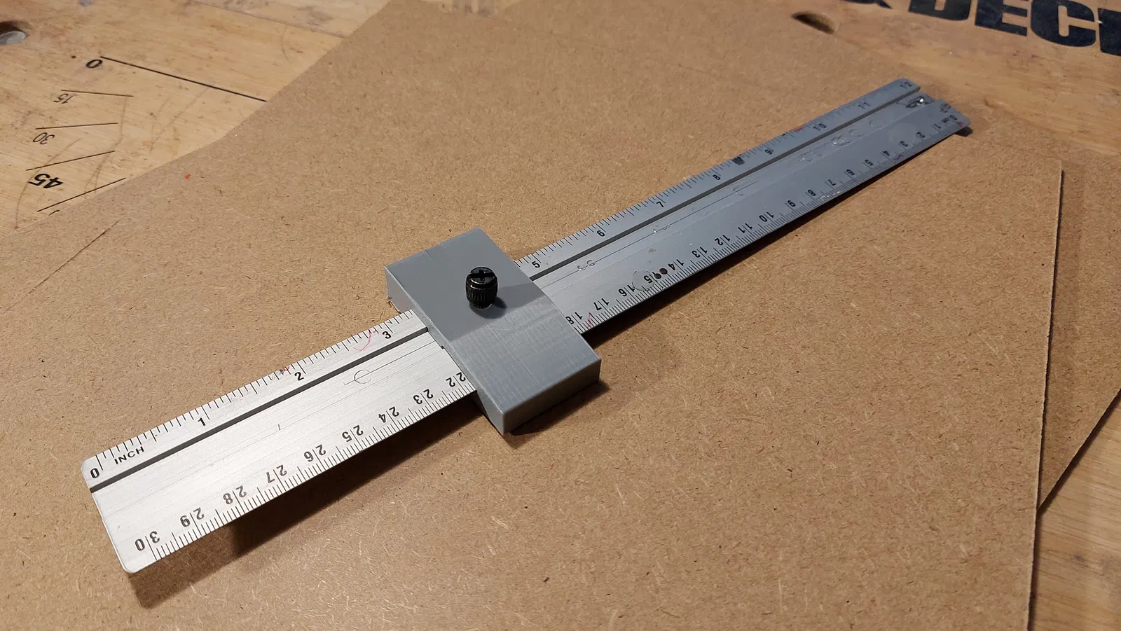 Một dụng cụ chặn thợ mộc để kẻ các đường song song cho thước kẻ rẻ tiền từ Action Market.