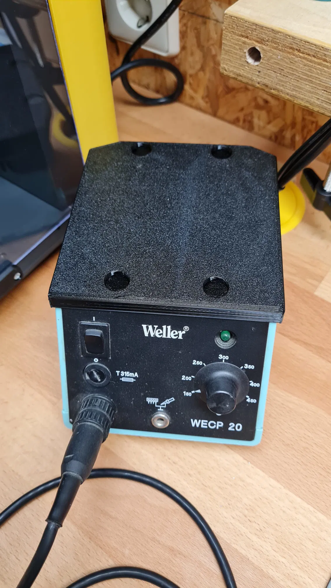 Bộ nâng cấp Weller WECP20, một giải pháp tiết kiệm không gian cho trạm hàn Weller WECP 20 và giá đỡ len hàn. Được in từ PETG với các thông số layer, tường, infill và top được tối ưu hóa.