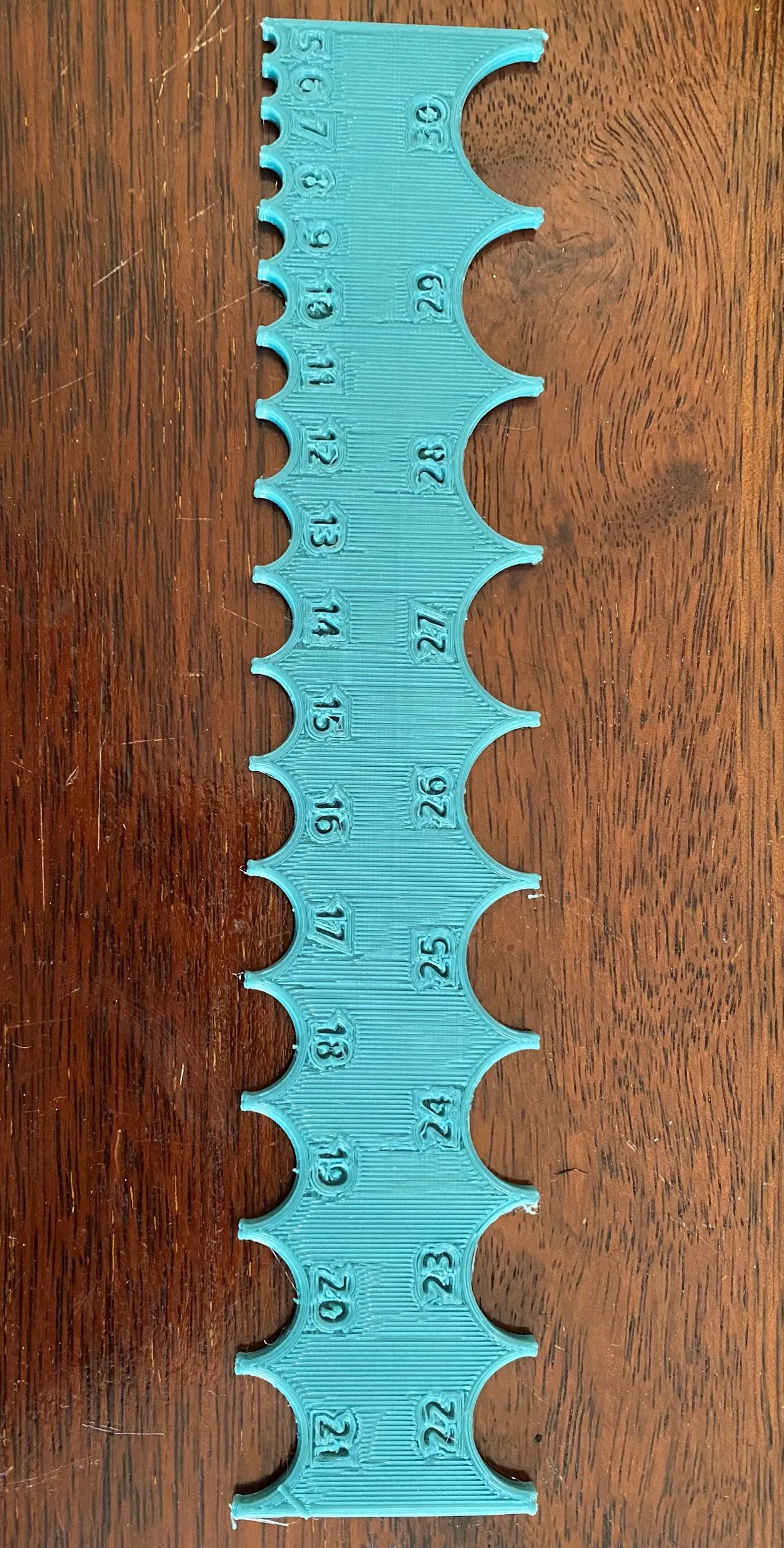 Có hai loại thước đo; một loại nhỏ hơn, dùng cho các góc lượn từ 5mm đến 20mm và có chiều dài tổng cộng 134mm, và một loại lớn hơn có thể dùng cho 5mm - 30mm, tuy nhiên nó dài 257mm, có thể sẽ không vừa với máy in của bạn. Mình thì xoay sở đặt nó nằm chéo trên bàn máy 220mm x 220mm là vừa khít.