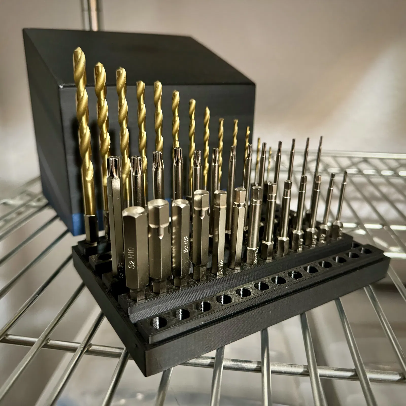 Cái hộp đựng đồ này được thiết kế để chứa các mũi khoan và mũi vặn vít chuôi 1/4". In phần nắp thì úp mặt trên xuống nha. Cả hai đều là những bản in đơn giản. Mình đã in bằng máy OPXL2H với input shaper ở tốc độ 0.32 bằng PolyMaker PETG.