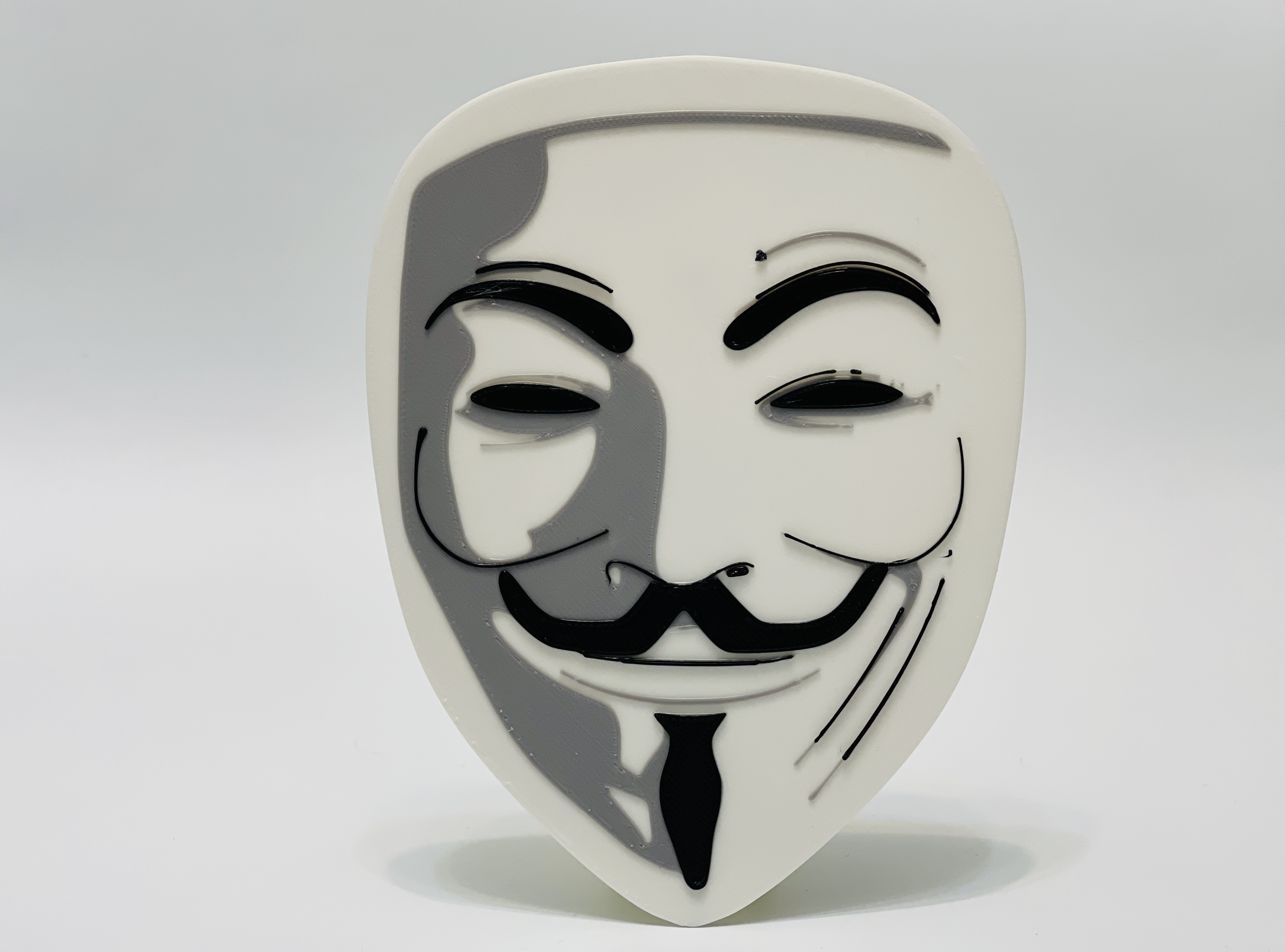 Mặt nạ Guy Fawkes, biểu tượng của phim V for Vendetta. Thiết kế này cho phép đổi màu dây tóc dễ dàng để tạo hiệu ứng bóng đổ, với các lớp in và điểm đổi màu được chỉ định rõ ràng. Thích hợp làm đồ trang trí, móc khóa hoặc treo tường.