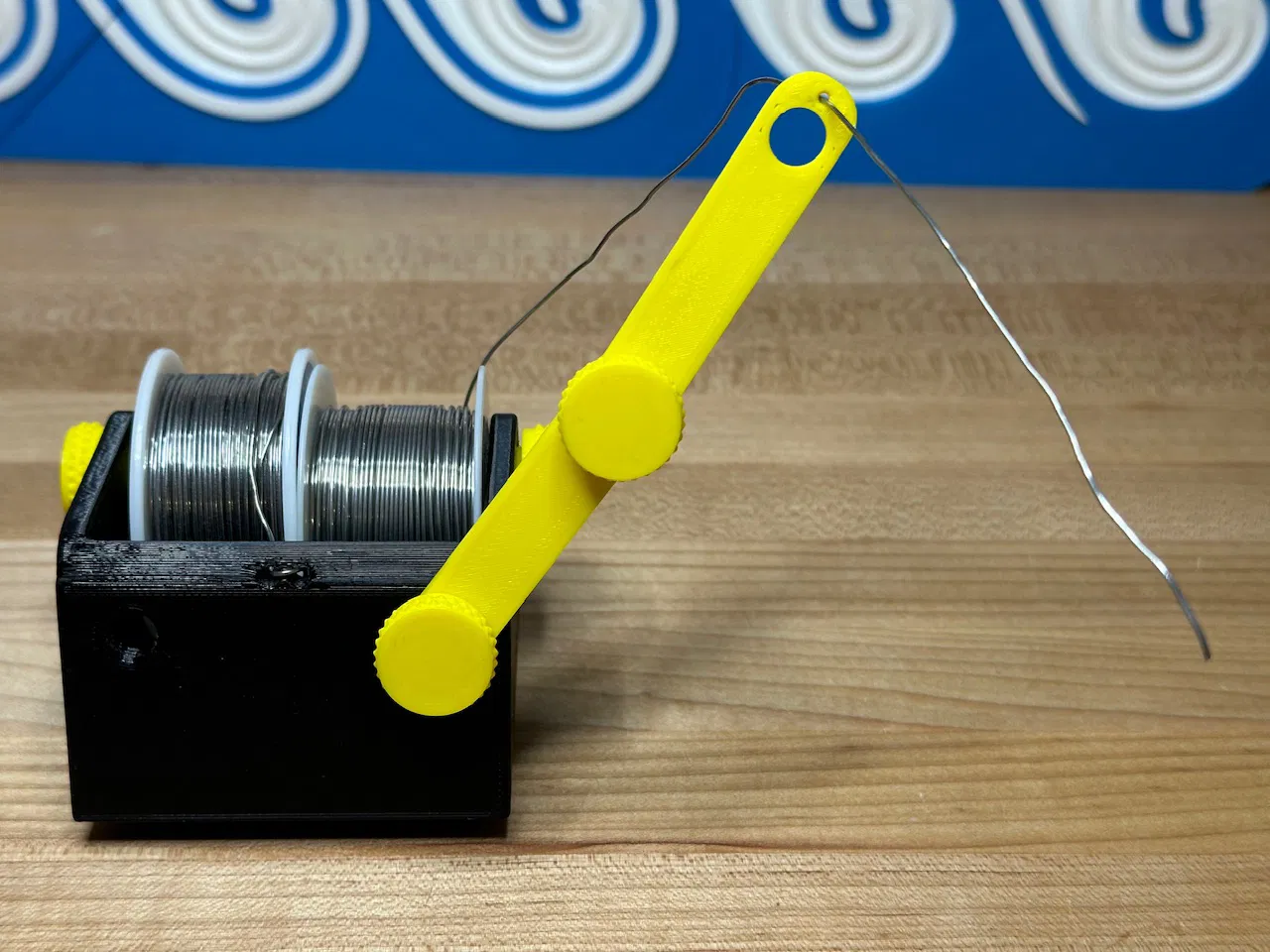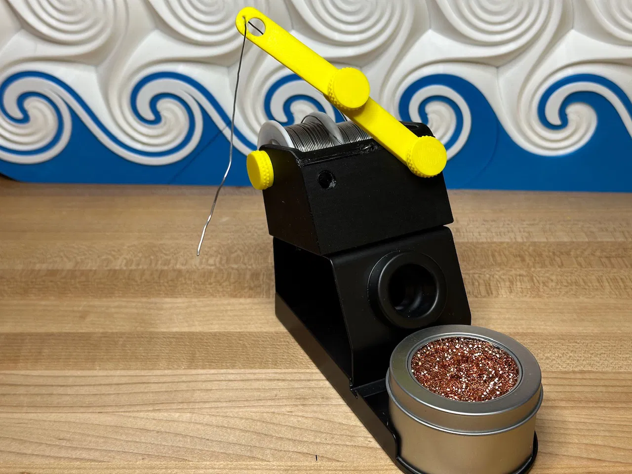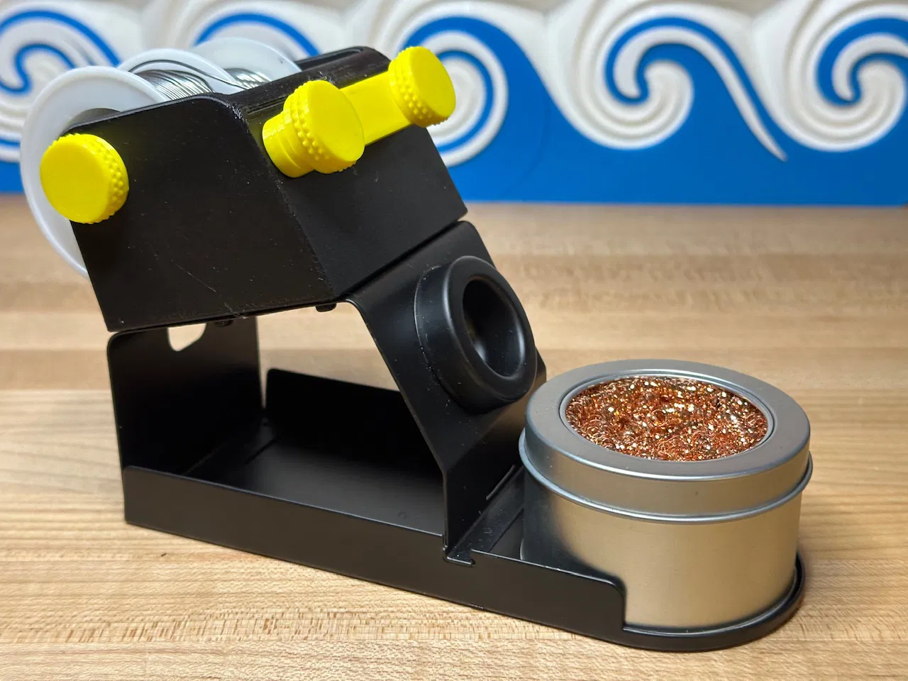 Nó có thể chứa hai cuộn thiếc hàn - ¼ pound, và có các lỗ để luồn thiếc và giữ cố định khi bạn hàn xong. Các cánh tay (màu vàng trong ảnh) có thể gập ra để đầu thiếc hàn nằm phía trên khu vực làm việc của bạn. Khi hàn xong, chúng có thể được thu lại và vặn vào thân chính.