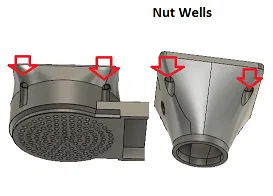 Các bộ phận này chứa các khe giữ đai ốc để giữ các vít M3x14 dùng để gắn các bộ phận này vào quạt. Đai ốc phải được lắp vào các bộ phận trước khi quạt được gắn vào từng bộ phận một. Phương pháp tốt nhất để thực hiện việc này là lắp tạm thời một vít có độ dài phù hợp vào phía quạt của bộ phận (mà không cần lắp quạt) và bắt đầu vặn đai ốc vào vít. Sau đó, đai ốc có thể được đặt đúng vị trí bằng cách siết chặt vít hoặc bằng cách gõ nhẹ vào đai ốc bằng một dụng cụ đục lỗ có kích thước xấp xỉ bằng đai ốc. Sau khi đai ốc đã được đặt đúng vị trí, hãy tháo vít.