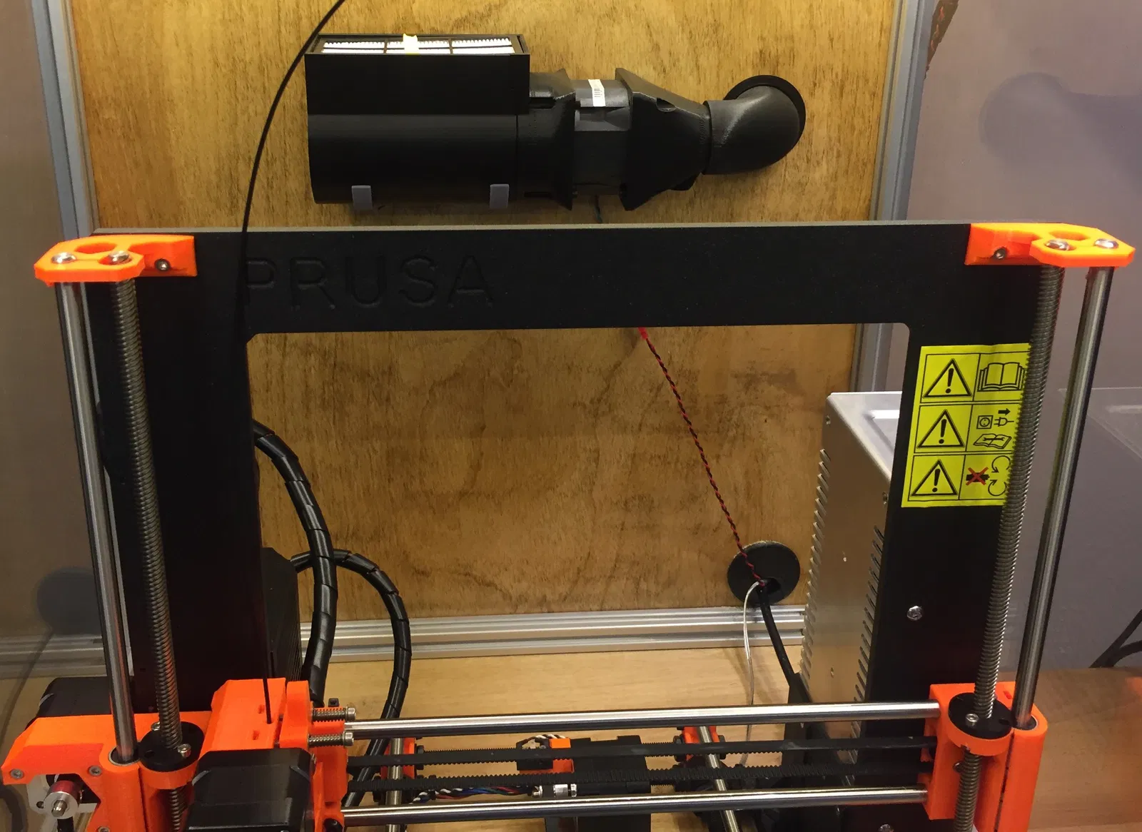Hình dưới đây cho thấy Bộ lọc HEPA được lắp trong vỏ Prusa i3 MK2S. Lưu ý vị trí của Mount, Exhaust Tube, và dây nguồn. Không nhìn thấy là lỗ thông hơi tuần hoàn của Nozzle, lỗ này hướng xuống. Ngoài ra, hãy lưu ý đầu nối Fan đến Speed Controller chỉ có thể nhìn thấy bên dưới thanh đỡ i3 phía trên.