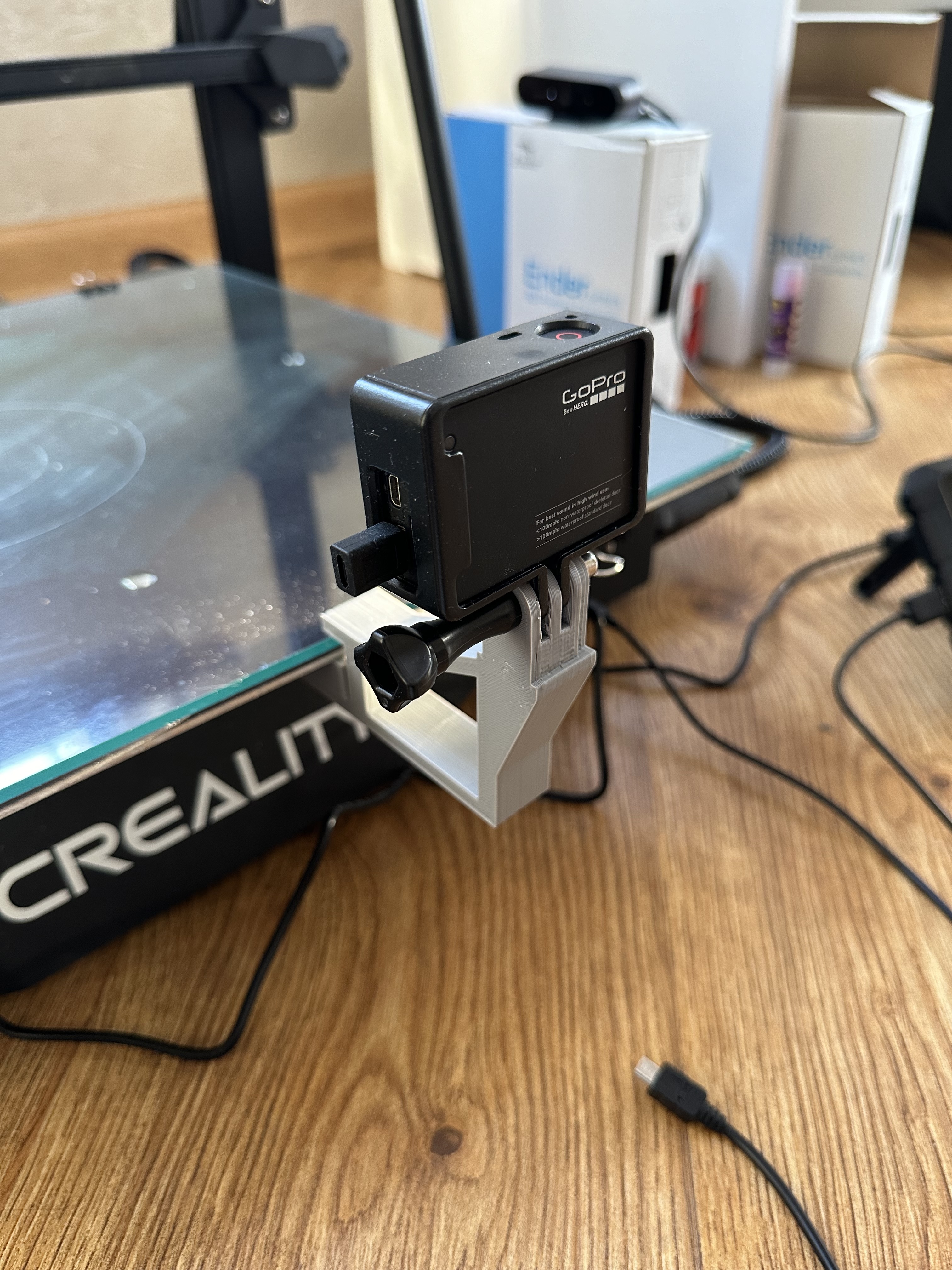 Giá đỡ GoPro đơn giản gắn vào khay máy in Creality CR-M4, giúp bạn quay timelapse quá trình in ấn. In với 15% infill, riêng phần đế gia cố 100% infill cho bền.
