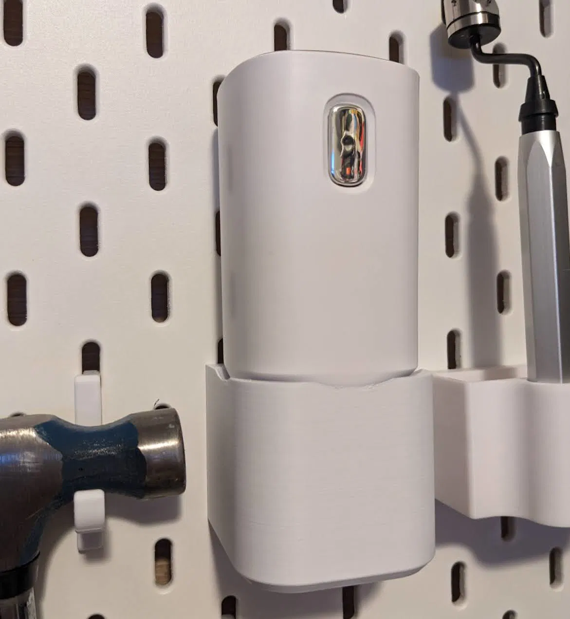Đây là một cái kẹp giữ cho bơm hút chân không sạc được bán trên Amazon dưới các thương hiệu Amolen, Ovv3d và có thể cả các hãng khác nữa. Cần bật chế độ hỗ trợ (support) khi in. Khớp nối sẽ hơi khít với các bảng Skadis chưa hoàn thiện và sẽ chặt hơn với các bảng đã sơn.