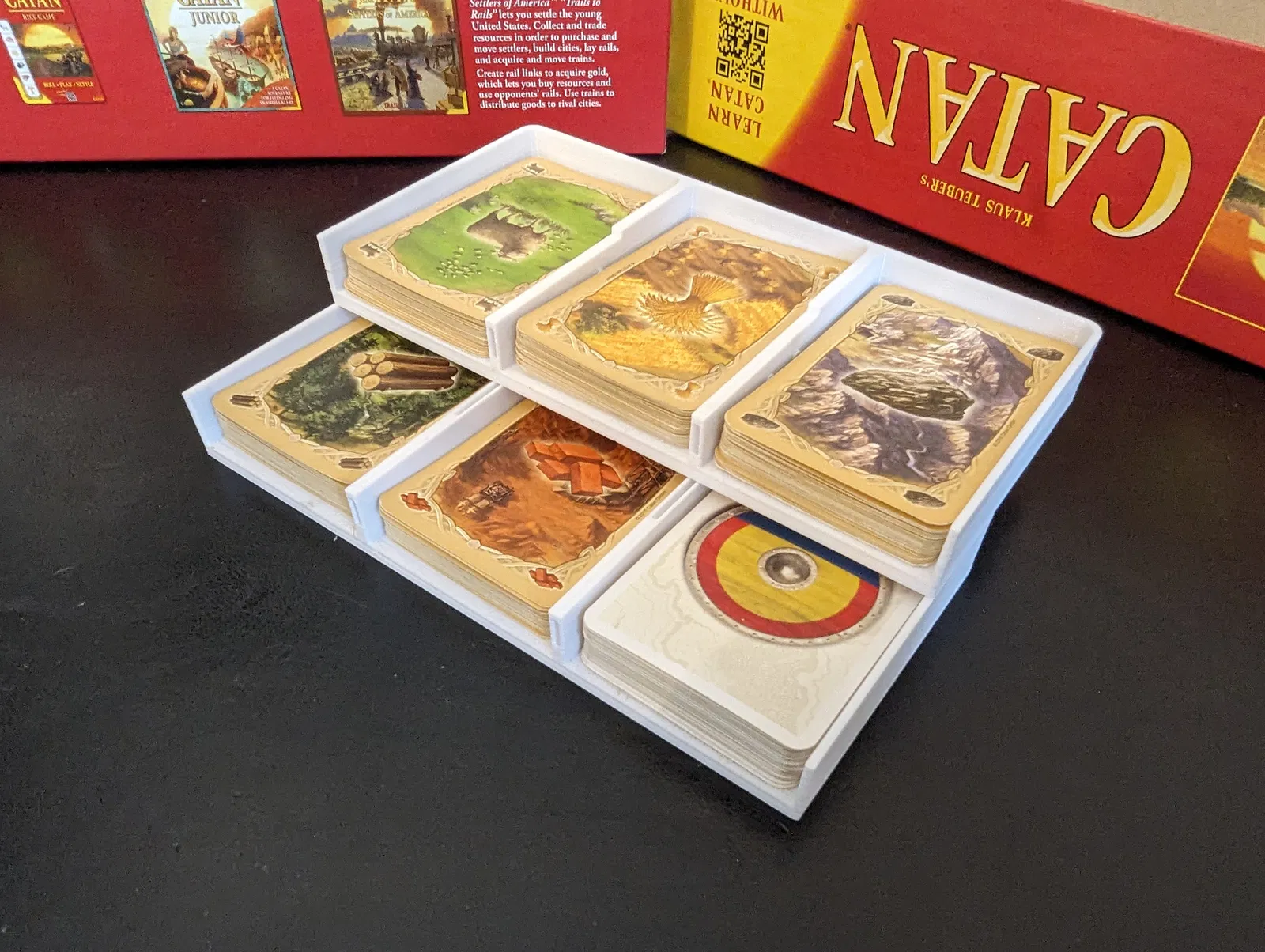 Giá đỡ thẻ Catan có thể gấp lại (phiên bản US: 54mm x 80mm). Sản phẩm này vừa vặn với hộp đựng mà tôi đã thiết kế trước đó. Để lắp ráp, bạn dùng sợi filament làm trục xoay cho bản lề. In không cần đế đỡ.