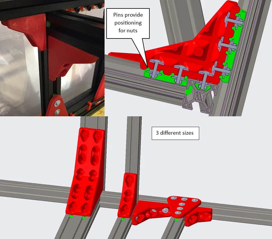 Các bộ phận nhôm định hình 3030 và 3060. In không cần hỗ trợ, cố định bằng vít M4 và vòng đệm. Dùng đầu phun .4 hoặc .6 với các lớp tường khác nhau tùy chọn. Vật liệu phù hợp: PLA, ABS, ASA, PC & vật liệu gia cường.