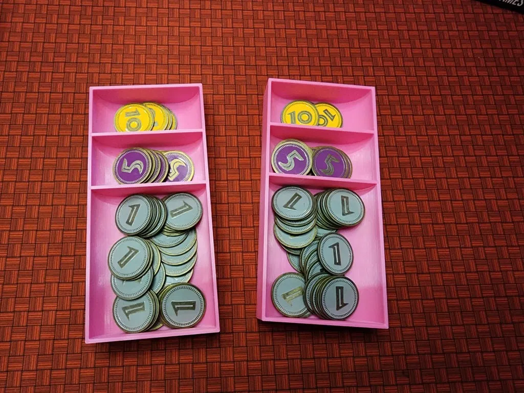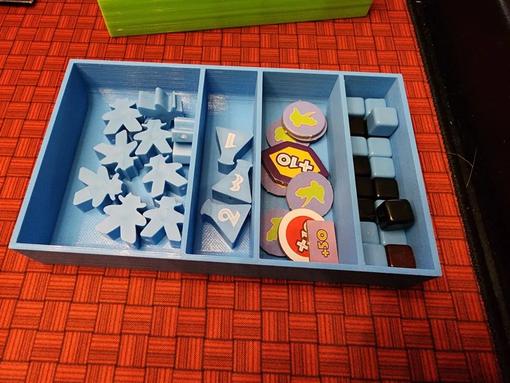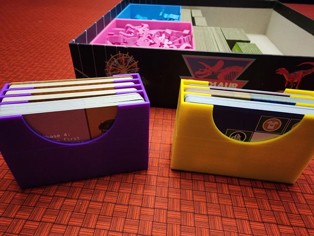 In 1 cái "DI_Specialist_Objective_Cards.stl" In 1 cái "DI_Module_Cards.stl" In 1 cái "DI_Card_Spacer.stl.stl" - Miếng đệm nhỏ để giữ mọi thứ không bị xê dịch In 1 cái "DI_Land_Dinos.stl" - Chứa hết mấy con khủng long trên cạn, trừ con T-Rex. Còn chứa mấy viên gạch công thức khủng long và gạch khu vui chơi cho khủng long trên cạn. In 1 cái "DI_Marine_Creatures.stl" - Chứa hết mấy con khủng long dưới biển. Còn chứa mấy viên gạch công thức khủng long và gạch khu vui chơi cho khủng long dưới biển. In 1 cái "DI_Facilities and Executives.stl" - Chứa hết mấy viên gạch Cơ sở vật chất, Thẻ và Token Điều hành, con khủng long T-Rex, mấy viên gạch khu vui chơi chỉ hoạt động với các cơ sở và điều hành cụ thể, 8 khối vuông màu đen, 3 token chỗ ngồi, 3 token khu vui chơi Fantasy Wild, mấy con khủng long baby, mấy con dê, mấy quả trứng khủng long. In 2 cái "DI_Cash_short_X2.stl" - Tiền. Vừa với token tiền giấy hoặc tiền xu.