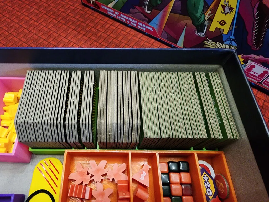 In 5 cái "TL_Player_Trays_X5.stl" - Chứa hết bộ phận của người chơi lúc bắt đầu. In 1 cái "TL_DNA_Dice.stl" - Chứa hết mấy viên xúc xắc DNA. In 1 cái "TL_Plot_Twist_Box.stl" - Chứa mấy lá bài Plot Twist cũng như tất cả xúc xắc và meeples đặc trưng cho Plot Twist. In 1 cái "TL_5th_Player_Box.stl" - Chứa hết mấy con Patron và Hooligan cho người chơi thứ 5. Thêm vào bao màu xanh lá nếu chơi với người chơi thứ 5. In 1 cái "TL_Attractions_Labs.stl" - Chứa hết mấy viên gạch Khu vui chơi và Phòng thí nghiệm.