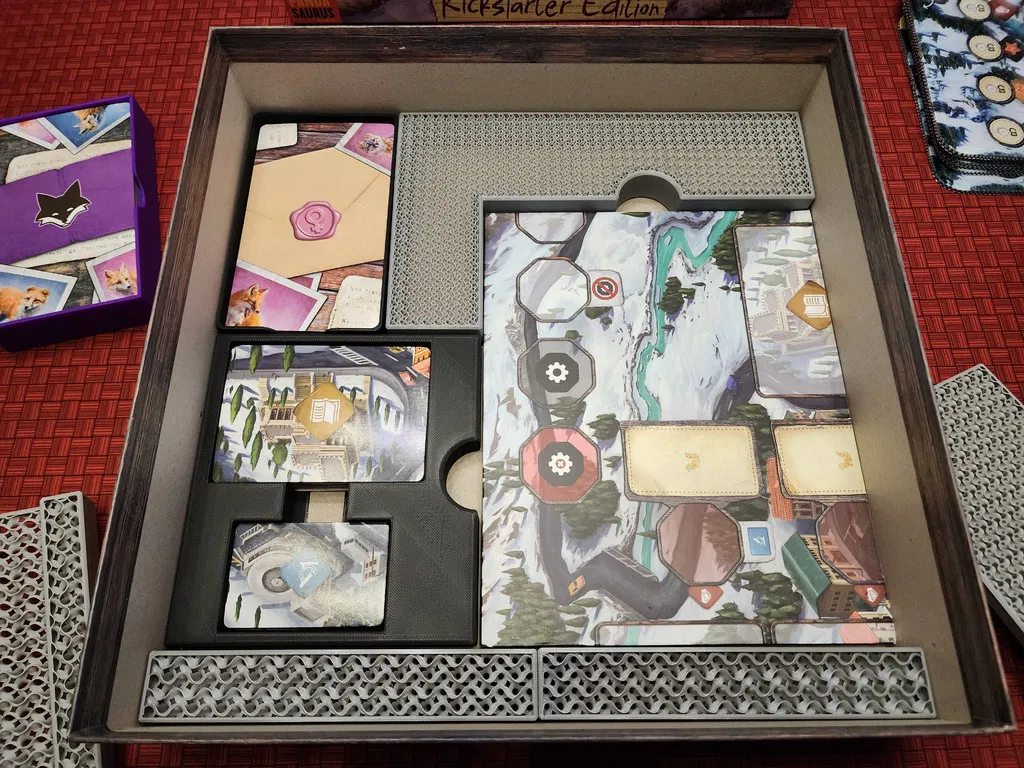 Tôi thích cái thiết kế tổng thể của bộ insert gốc nhưng cảm thấy có vài chỗ có thể cải thiện. Tôi là người ủng hộ nhiệt tình việc làm cho quá trình setup game nhanh nhất có thể, đồng thời giúp người chơi dễ dàng tiếp cận các thành phần. Tôi đã thực hiện một số thay đổi chủ yếu ở các khay người chơi, nay chứa tất cả các vật phẩm khởi đầu của người chơi bao gồm cả bút dạ quang và thẻ bài, cũng như các khay đặc điểm (trait). Việc này đòi hỏi phải sửa đổi gần như toàn bộ bộ insert, nhưng trong hộp vẫn còn nhiều miếng đệm vì nó quá rộng. Hy vọng, nếu có thêm bản mở rộng nào trong tương lai, tôi có thể thay thế các miếng đệm bằng các thành phần khác.