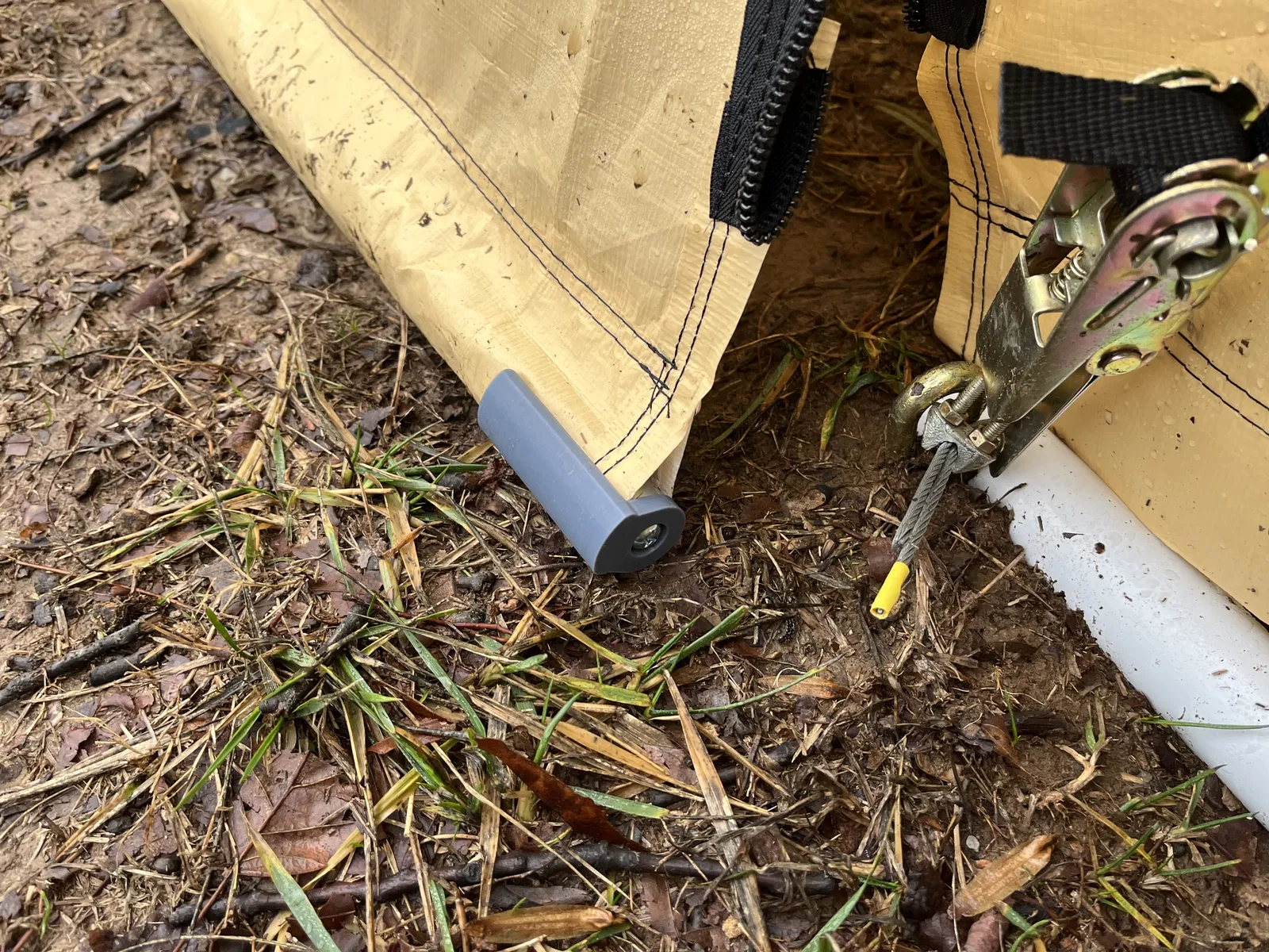 Nên là, ý tưởng là luồn cái ống dẫn nước (conduit) 3/4" vô cái chỗ may sẵn ở dưới chân cửa. Tui làm mấy cái kẹp này để gắn vô hai bên ống dẫn, rồi có cái kẹp để giữ ống dẫn vô vải cửa. Tui sẽ đăng hình lúc lắp lên cho coi nha.