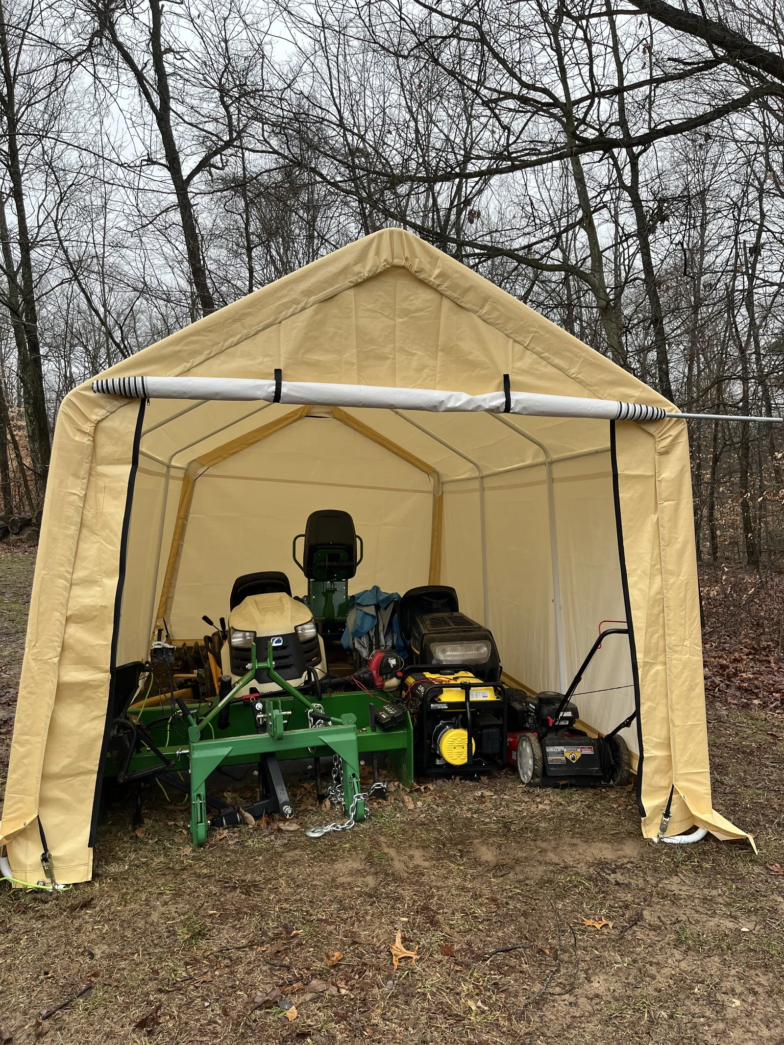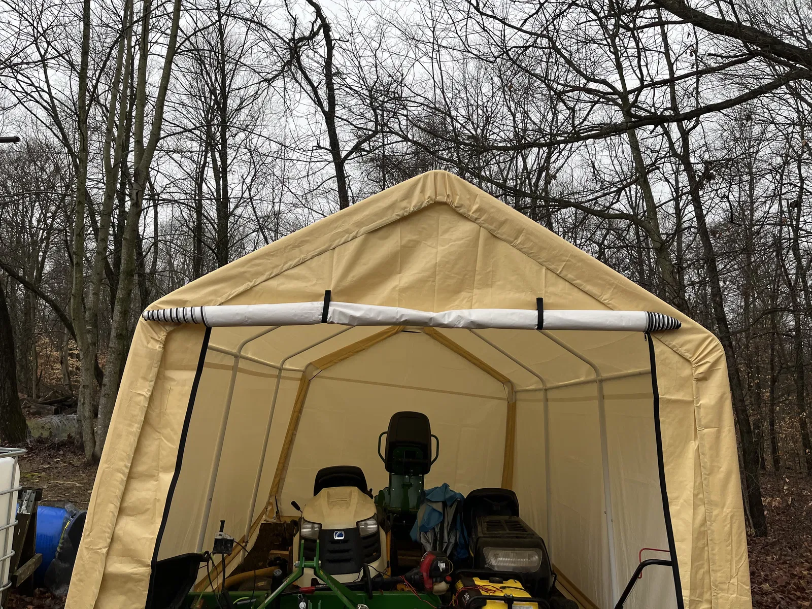 Bữa tui có mua cái nhà bạt/nhà để xe ngoài trời dịp Lễ Tạ Ơn đó… cái nhà bạt này kích thước 10x17, để đồ đạc với máy cắt cỏ là okela. Tui nó có cái cửa lật ở phía trước, với hai cái khóa kéo hai bên. Cái vụ mà cuốn cửa lên á, khó chịu ghê… cái chất liệu nó nặng nên cuốn không có đẹp, nó cứ bị nhăn lại.