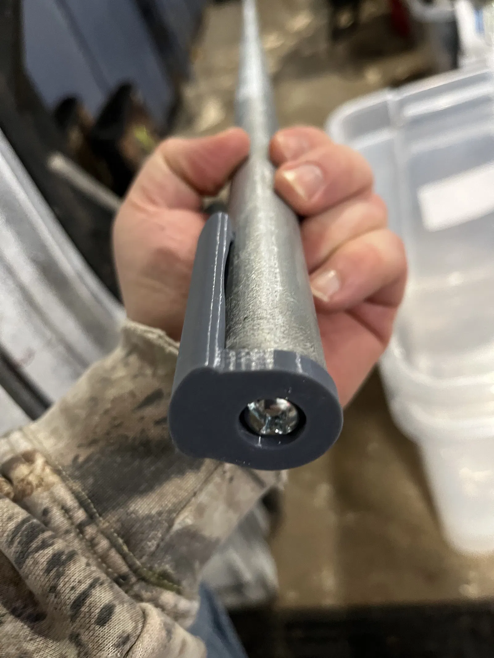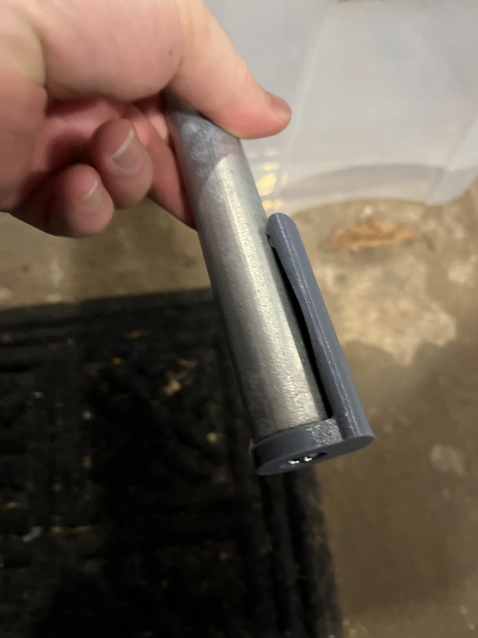 Tui làm cái nắp bịt ống dẫn nước 3/4" kèm kẹp để giữ cửa nhà xe khỏi bị nhăn khi cuốn lên. Cái này làm bằng PETG, dùng ốc ¼-20, gắn vô ống dẫn nước rồi kẹp vô vải cửa. Lắp xong thấy okela lắm, cuốn cửa dễ hơn hẳn!