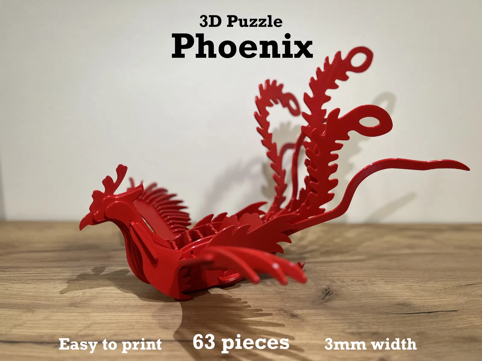 Mô hình "Phượng Hoàng" 3D Puzzle gồm 63 mảnh ghép. Kích thước gốc mỗi mảnh rộng 3mm. Có thể in nhỏ hơn, dùng PLA/PETG, độ đặc 15%. Thời gian in ~26.5 tiếng.