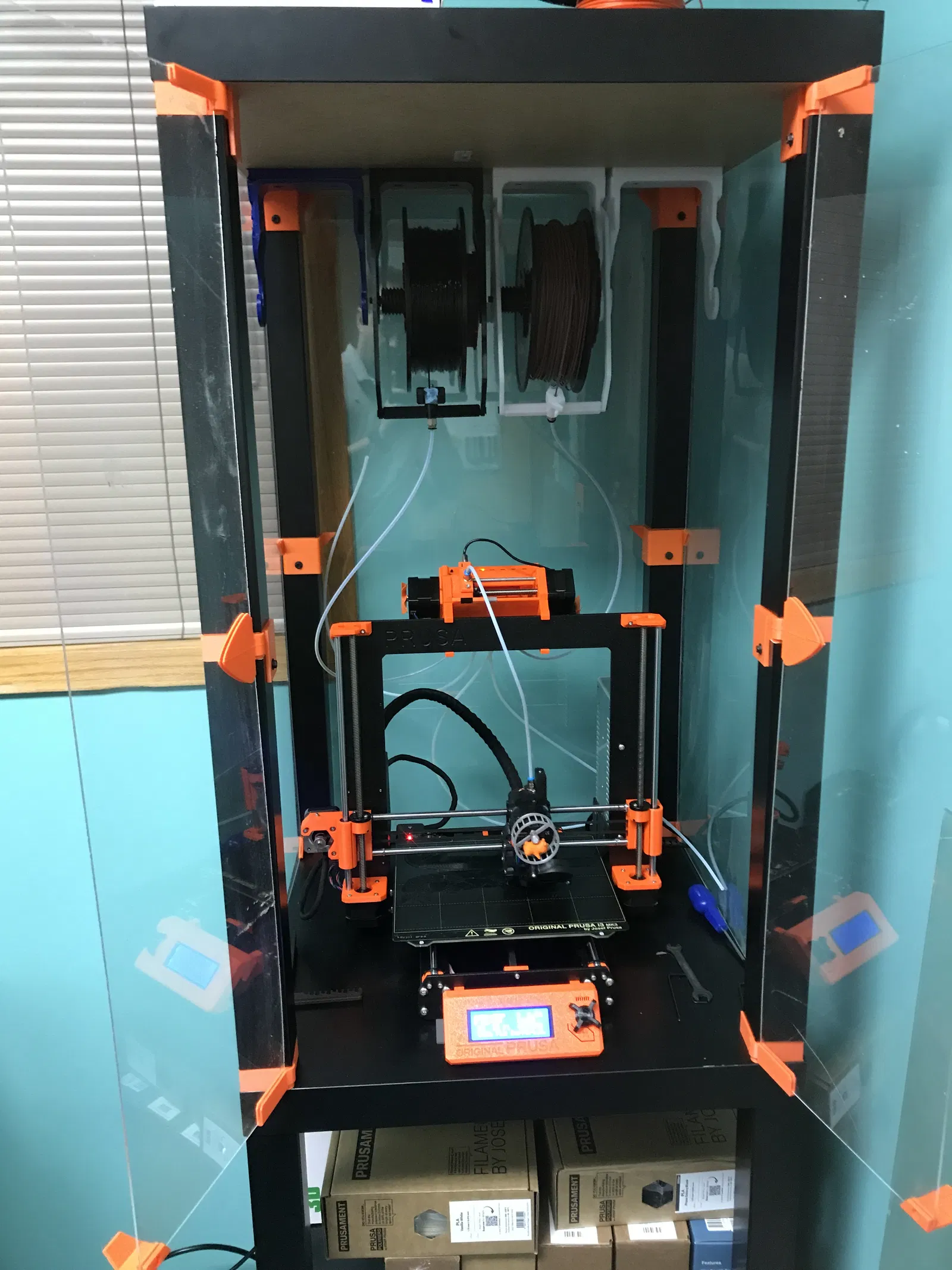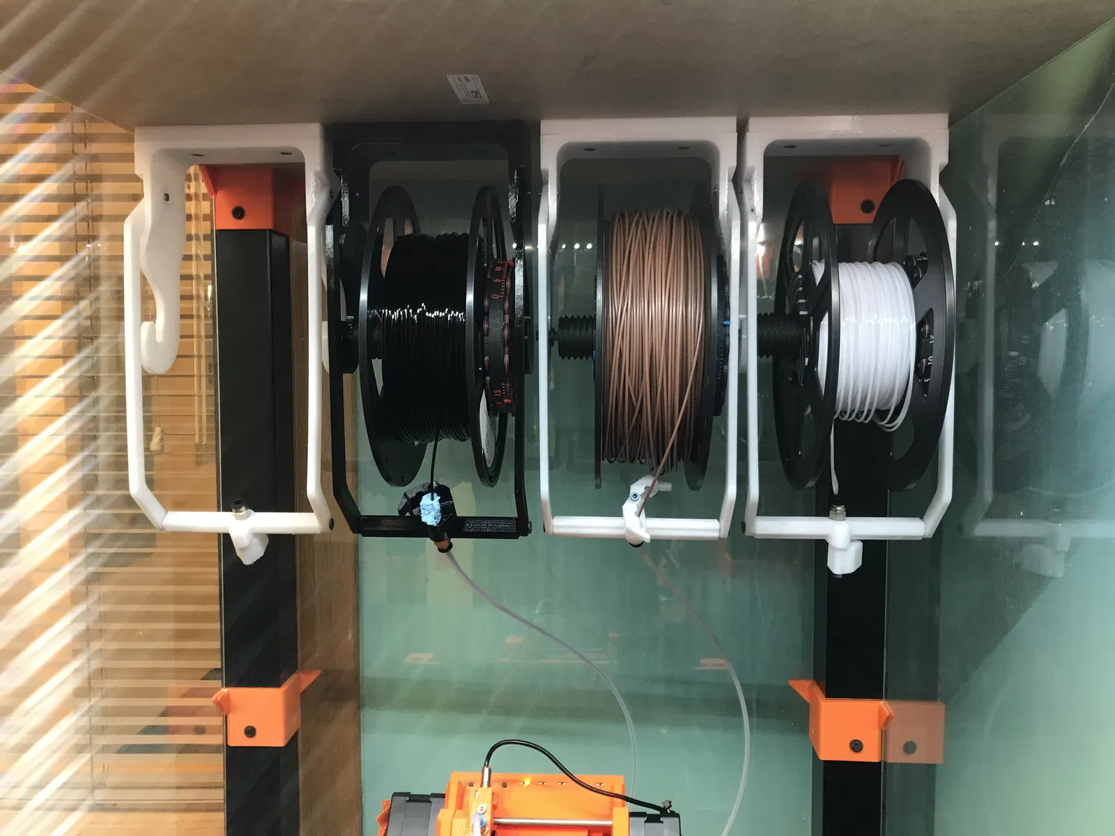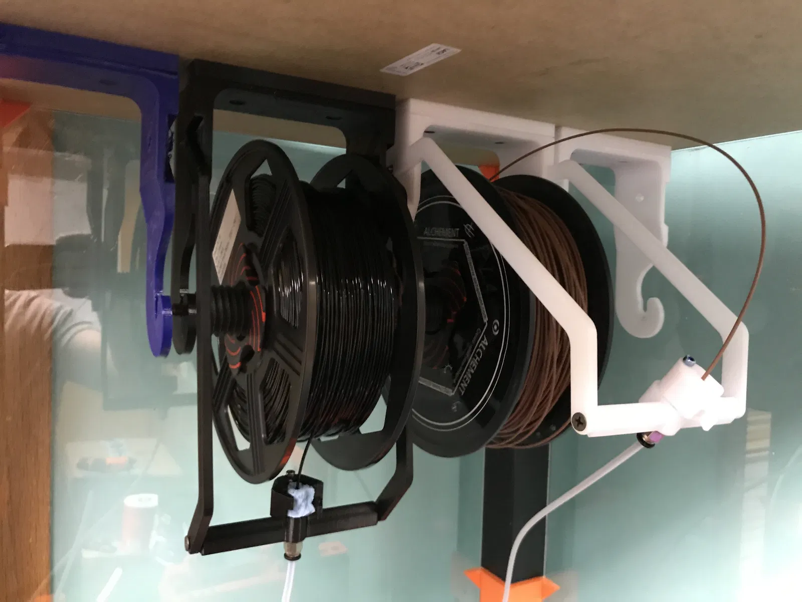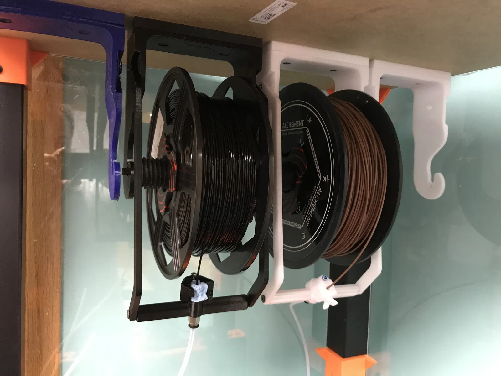 - Mất nhiều thời gian để thay cuộn dây vì bạn phải tháo bộ tua lại ra, gắn vào cuộn mới rồi mới chỉnh vị trí vào giá treo của bạn. Cuối cùng, tôi đã bỏ cuộc với các bộ tua lại (Re-Winders). Bộ đệm (Buffers) đáng tin cậy hơn nhiều. Và bộ đệm mới của tôi rất nhanh và dễ nạp, nên tôi rất hài lòng. ### Hướng dẫn in Đây là mô tả cũ cho các giá treo này. Tôi thực sự thích . Nhưng các cánh tay giữ dẫn hướng sợi filament để đầu sợi filament ở phía trước cuộn dây. Vì MMU2 của tôi được đặt cách các giá treo này khoảng 9 inch bên dưới, ống PTFE sẽ làm cho sợi filament chỉ ra một góc kỳ lạ. Điều đó gây ra một số sự cố khiến sợi filament bị rơi ra khỏi cuộn dây. Vì vậy, tôi đã tạo ra các cánh tay mới này để thay đổi vị trí của bộ giữ ống xuống thấp hơn. Bây giờ sợi filament được căn chỉnh gọn gàng trên các cuộn dây. Ngoài ra, tôi đã thêm một số lỗ lục giác để các đai ốc 3M được siết chặt vào vị trí và không bị lỏng theo thời gian. Điều này có nghĩa là bây giờ có cánh tay phải và cánh tay trái. Bạn sẽ cần các vật dụng sau để lắp ráp bộ giá treo hoàn chỉnh: 4x Vít thạch cao 6X1 1/4" 2x Vít 3M 10mm 2x Đai ốc 3M (khuyến nghị loại khóa nylon) 1x Vít 3M 25-30 mm 1X Phụ kiện thẳng nam PC4-M10 cho ống đẩy khí nén PTFE