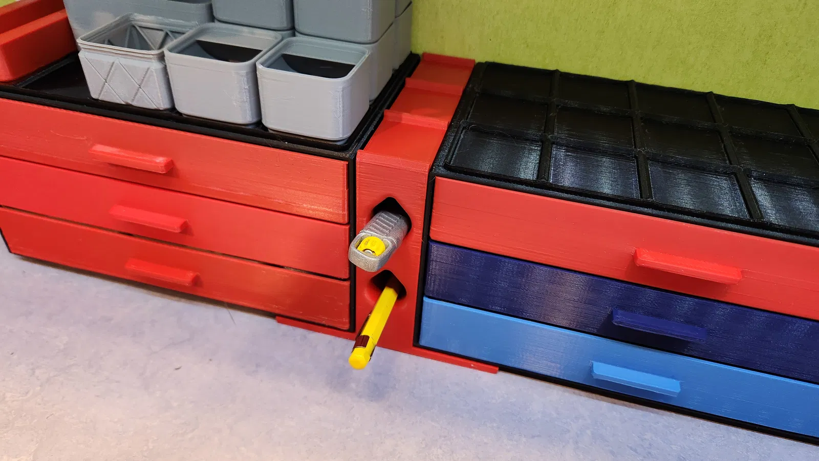 Giữ hai ngăn kéo lại với nhau và cung cấp không gian lưu trữ. Miếng đệm này tạo khoảng cách giữa hai ngăn kéo giúp đồng bộ họa tiết Gridfinity, cho phép đặt các bộ phận Gridfinity vươn qua cả hai ngăn kéo. Rất tiện để cất giữ các vật dụng nhỏ.