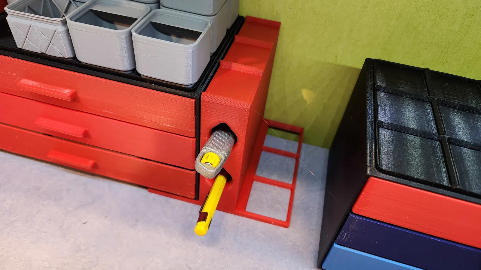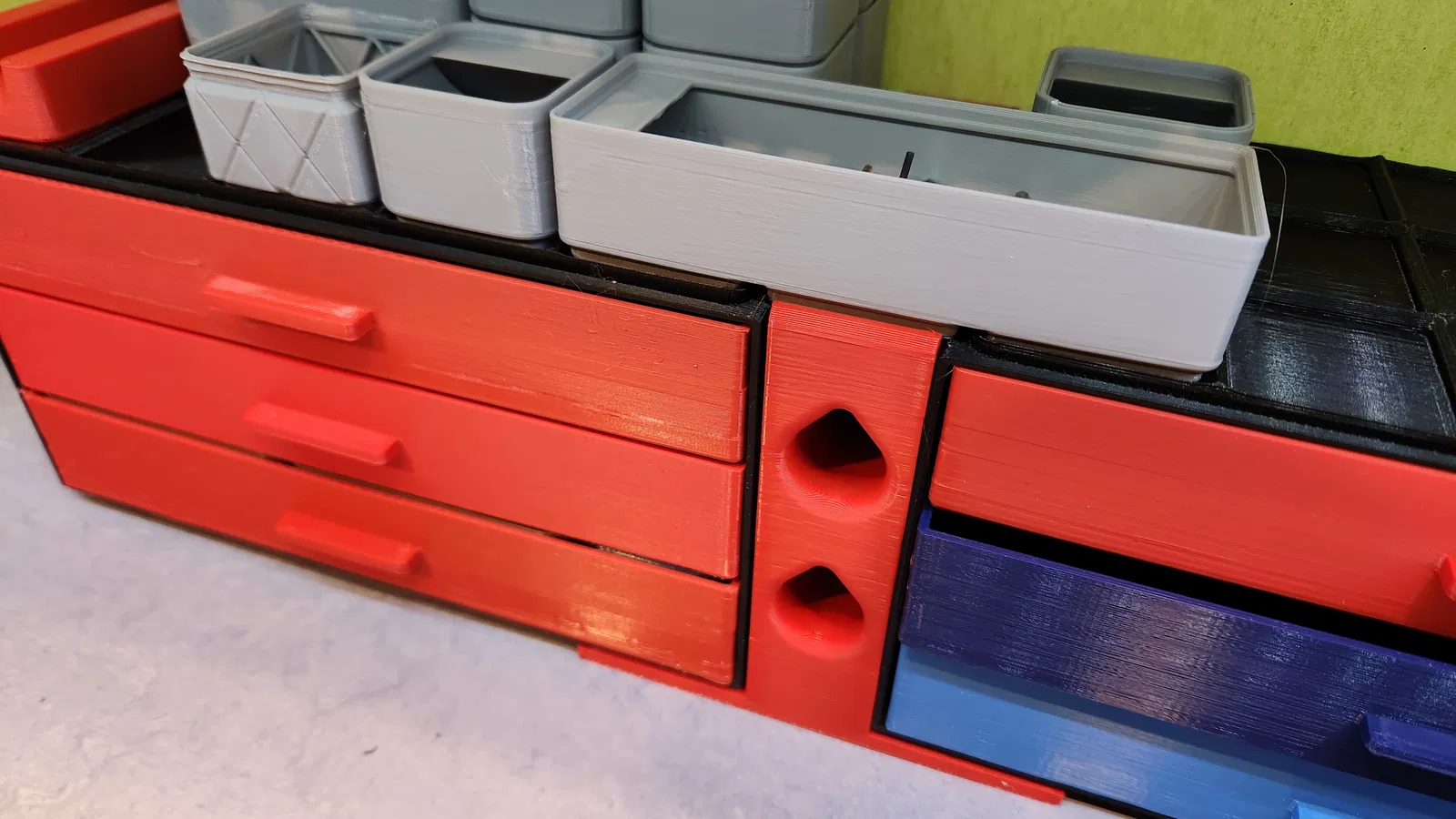 Nó tạo khoảng cách giữa hai ngăn kéo đúng mức để đồng bộ hóa họa tiết Gridfinity ở trên. Điều này cho phép đặt các bộ phận Gridfinity lên trên, vươn qua hai ngăn kéo.